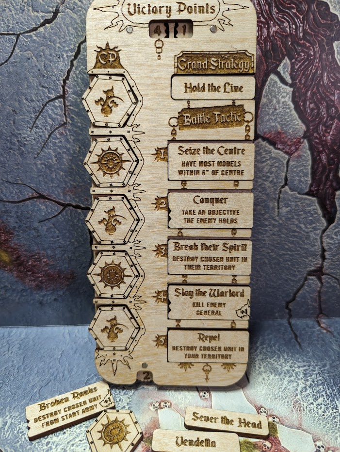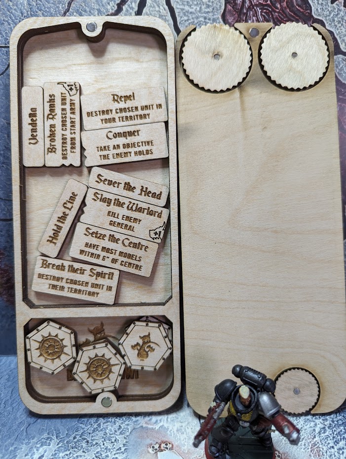 The Tactical Command Board is a neat little scoreboard for both players to use to keep track of both primary and secondary scores, command points and what turn it is using 16mm dice. It features a handy slot to place the Primary Objective card. While slightly too big to fit within the Battle Box, it’s still a good size to set off on the side for both players to see and track various info.