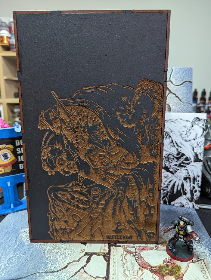 - Depending on which bundle you plumb for, you have the option of either the Dice Tray or Battle Box Lid. The lid is an additional sheet of MDF with the engraving of the Kiwi Aquila which fits neatly over the Mission Command Stack. Mine came with the Dice Tray which is engraved with Battle Kiwi’s special Black Edition Illustration of a Tech Priest both on the lid as well as on the laser engraved faux leather rolling area.