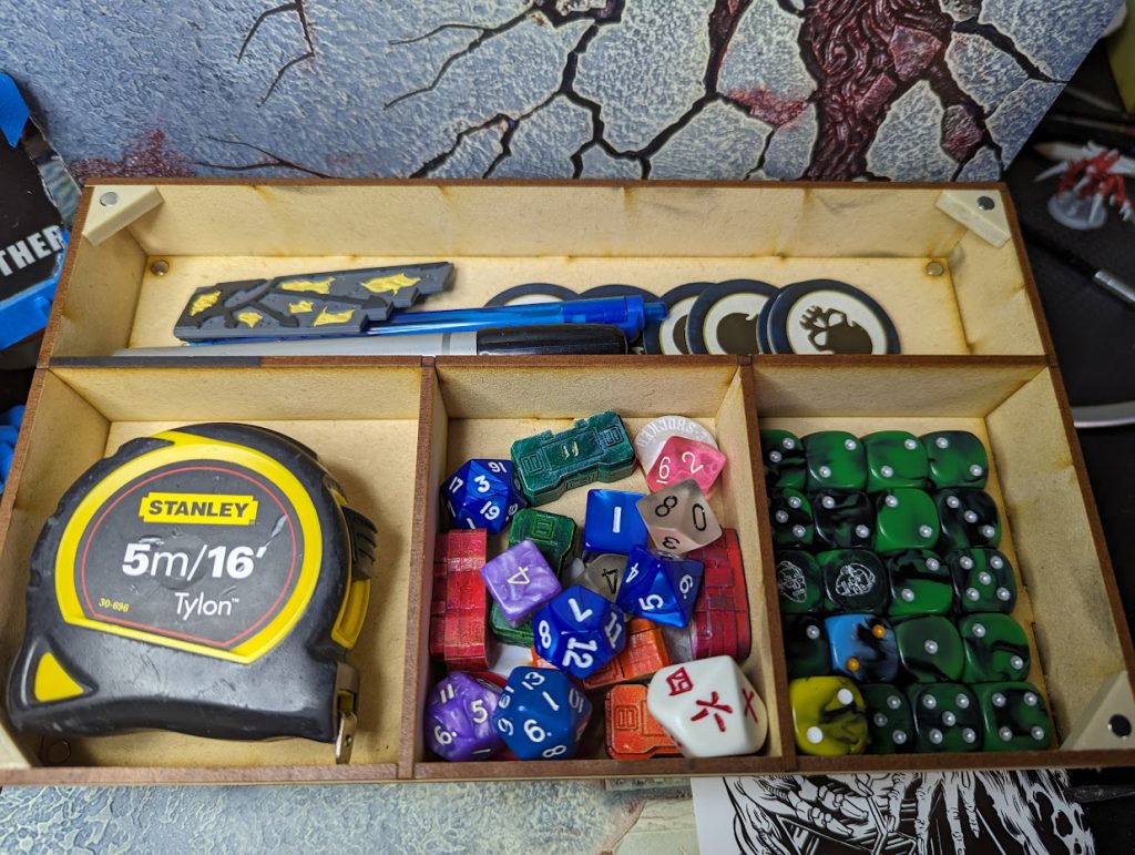 It’s a very well built piece of kit with some excellent joinery and magnetised so everything slots together like a dream. The faux leather lining of the dice tray makes a very satisfying noise as you roll your dice. The Mission Command Stack is brilliantly designed and I love the slots designed for the Secondary Mission Cards with indents making it super easy to switch out cards each round as needed. One minor bugbear to grumble about, the dials are a little sticky but with a little use I’m sure they’ll smooth out in time or I could hurry the process along with some wax perhaps.