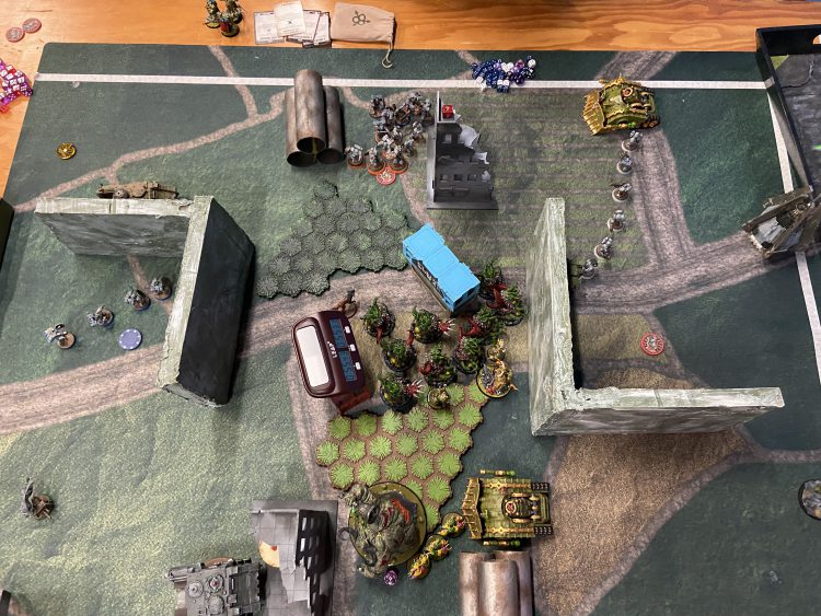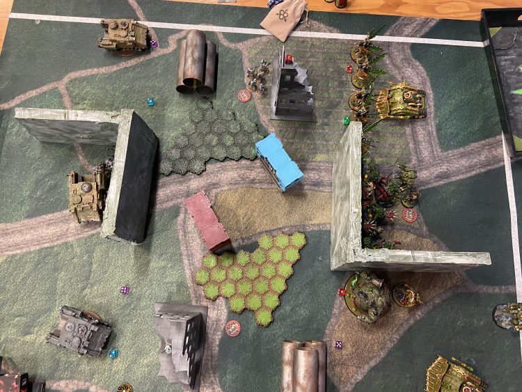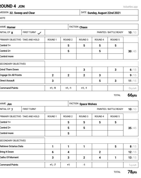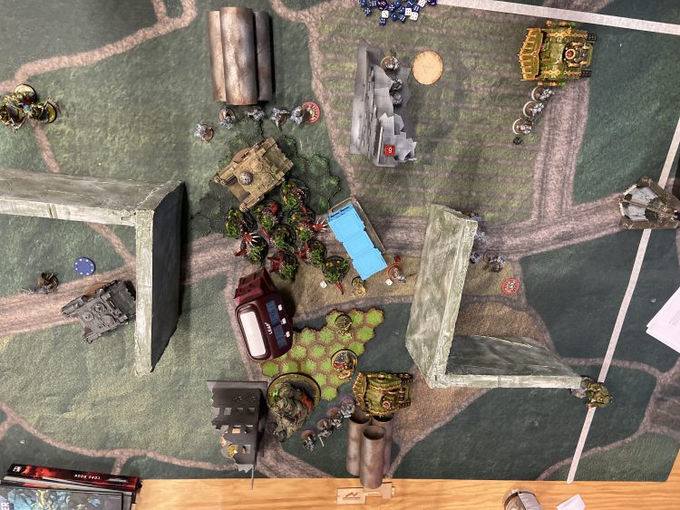 After round 3, the damage was done. I was out of serious combat threats and Homer had three Wardogs running around the table. I was able to outflank my Blood Claws into his backfield when I brought them down turn 3, then moved them up on turn 4 and charged the Cultists to steal his home objective. The end game state saw us flip table sides, and a critical Impulsor explosion that killed a Wardog gifted me a late points push and ensured I didn't need to take any more risks.