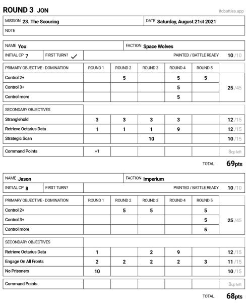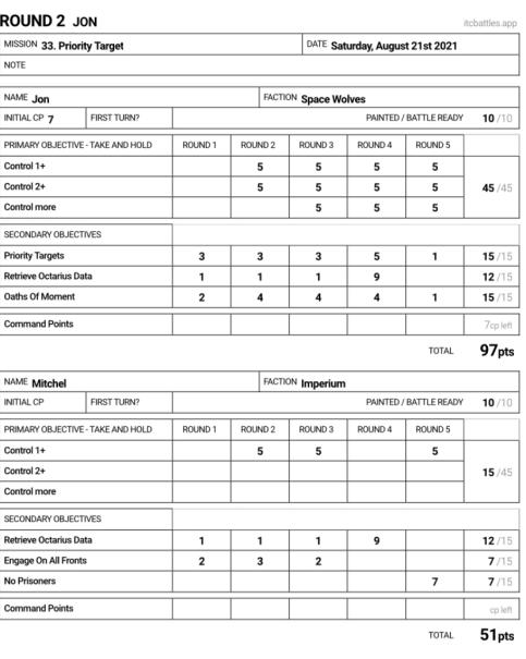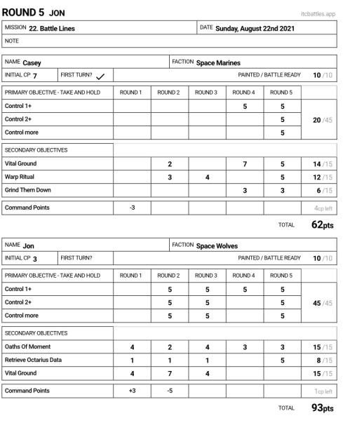 Casey had gone 3-0 to start the event off, and his only loss was in the previous round to Anthony's Hellion spam. I was pretty concerned with how I would be able to handle this level of durability and combat while still scoring my secondaries. This list wants to do the same things I do, but is far more durable, with the trade off of not being anywhere near as deadly. I cannot win a "1v1 me bro" moment in the mid-board, I have to keep this in mind, but even saying that I still picked Oaths of Moment because I know I'm able to rack up points with Impulsors and Cyberwolves, and by killing his VEHICLEs and CHARACTERs. It allowed me to tailor my win conditions to how the game state presented itself at any given moment.