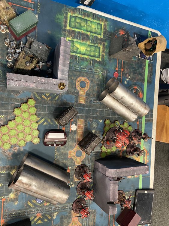 By turn 3 Jason had me on the ropes. His drops came in and did a severe amount of damage to several squads, leaving me with hard decisions to make in order to come back. I chose to shove my forces up and away from my own deployment zone, and sit on the 2 left-hand objectives behind some cover, setting myself up for mid counter-charges and continue to score Stranglehold. My warlord had to put the game on his back and one-shot two Wardogs in a single battle round, allowing me to clear the mid-table and ensure I would complete my Stranglehold points, along with denying Jason critical primary points in the fourth Battle Round. This proved to be the difference in the game. By the end, I chose to have several units run away and hide, so that Jason couldn't max out his No Prisoner points. This could not have been a closer game to finish out day one. The sportsmanship and the strategy on the table were top-tier, and these are the kind of games that competitive players go to events to find. Here is where you really prove yourself.