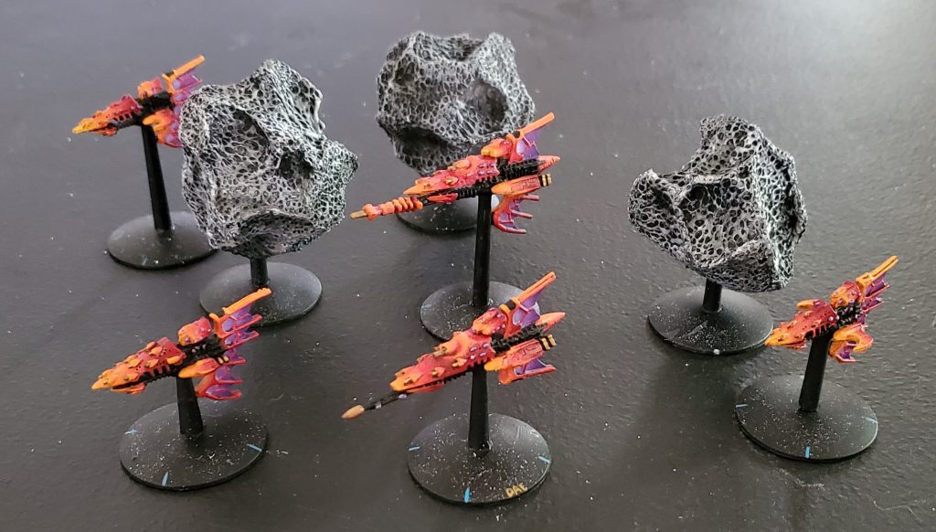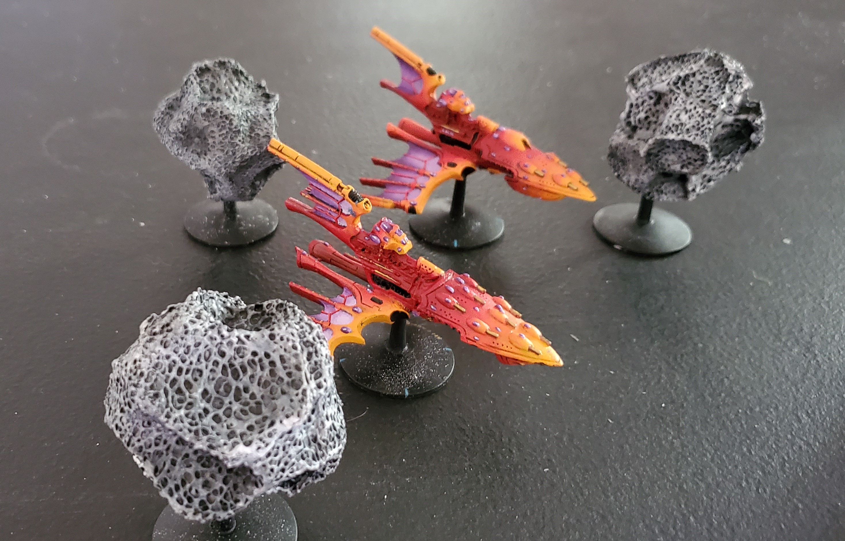 That said, there are significant drawbacks to all these boosts. All Eldar ships have a lower armor rating and fewer hullpoints making them susceptible to rapidly taking damage and becoming crippled. There is also a 50% chance to cause critical damage to Eldar ships with each point of damage they sustain which can rapidly deteriorate their capabilities. The range of their weaponry, across the fleet, is among the shortest in the game and their most significant strength, their mobility, may be greatly hindered by poor positioning. When effectively managed, they are the fastest ships in the game, but a savvy opponent can maneuver and force an Eldar player into a position where they cannot take advantage of their speed. This is because Eldar ships have three profiles based on their relation to the ‘sunward edge’. Putting an Eldar fleet in a position where they cannot effectively capture the solar winds leaves them open to counter weapon battery fusillades that will utterly cripple or destroy the fleet. Unlike shields used by other races, the holofields that are so effective at stopping non-weapon battery fire, do not actually protect the ship from things like blast markers, explosions, or gas clouds – which means that even basic phenomena can force attrition on Eldar vessels where a single point of damage can often have cataclysmic cascading effects. Finally, Eldar vessels, pirate princes, and rerolls are