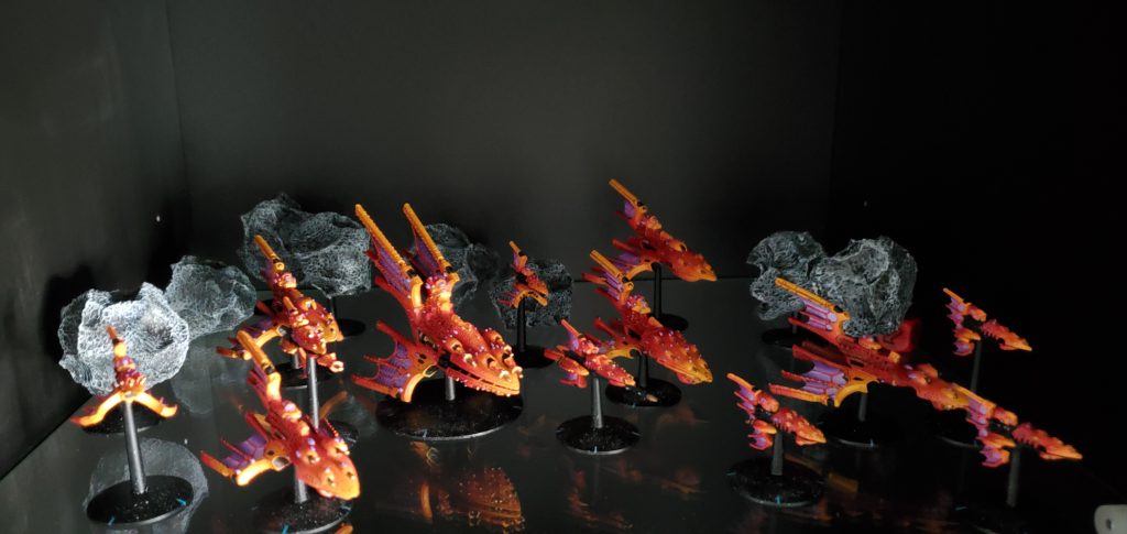 But wait, there’s more! Eldar armaments are also suitably special – their lance batteries (Pulsars) may score additional hits for each successful hit (which can be devastating when combined with a ‘Lock On’ special order) and their weapon batteries will always count an enemy vessel in the most advantageous targeting aspect on the gunnery table. Furthermore, Eldar Ordnance also has significant advantages – their torpedoes can only be destroyed on a ‘6’ by defensive turrets and may automatically re-roll the result for any torpedoes that miss their target making them the best torpedoes in the game. Similarly, Eldar bombers also require a ‘6’ to be hit by enemy defensive turrets and may re-roll the number of attacks each squadron may make. Finally, fighters squadrons have a 50/50 chance to remain on the board following a successful intercept of enemy ordnance.