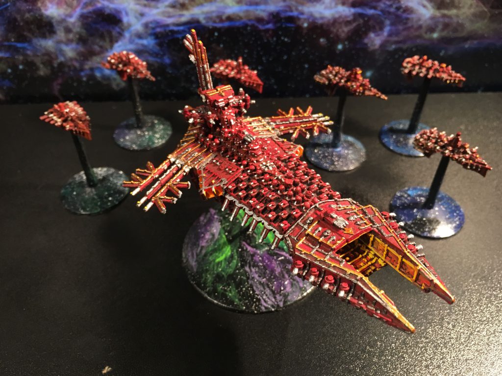 Close your eyes for a minute and imagine the most orky possible ship – did you think of a ridiculous, misshapen, cobbled together wedge of steel with giant engines whose sole purpose is to drive itself as fast as possible into an enemy ship? Because that is what this is – and it is fantastic. Like all escorts it sports a heavily armored prow, but it also gains a special rule upon ramming where it can inflict a lot of potential damage – hitting WAY above its weight class and making it a threat against even the largest capital ships. Unfortunately, it is probably also a suicide mission but that’s perfectly okay- because these bad boys are dirt cheap at 25 points. It also has a small weapons battery, but who cares about that, go drive into something.