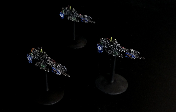 The Dirge class Raiders are extremely similar but trade a point in Lightning Arc offense and the loss of the Portal for an additional 10 cm of speed and a points decrease to 40. They play a similar role without needing to close the enemy fleet to take advantage of the Portal. Suffice to say, the Necron escorts are