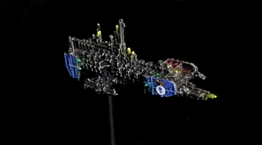 The Scythe class cruiser is a mainstay of Necron fleets - expensive at 275, it still carries a remarkable strength 8 Lightning Arc battery on the port/starboard beams and a devastating 4 Particle Whips with a 270-degree coverage arc that give it the capability to punish at range. Similar to the Tomb Ship it also carries a Star Pulse generator and a pair of Portals that can that can overwhelm when cascading pulses begin to stack up - another reason to force Brace's across the Necron fleet. The Scythes are fast at 30 cm, plus the usual All Ahead Full shenanigans but are slightly weaker in shielding at 5+.