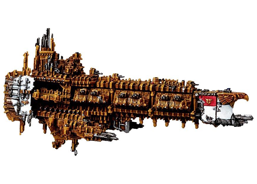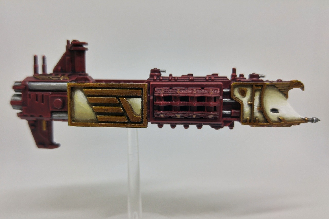 As the only line ship Space Marines have, this light cruiser has to be a jack of all trades. With a 25cm speed and 90° turns it's nimble, but only 6 hull points and a single shield. The 360° 6+ armour helps, but fundamentally this thing doesn't have staying power, so you need to use it wisely. Its modest firepower 4 broadsides are going to need to fire in concert with other ships, but the main draw here is that it can launch 2 Thunderhawks a turn and has a turret-mounted strength 3 bombardment cannon. That broad firing arc means you don't have to worry too much about your facing, but you