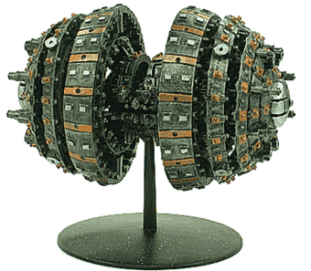 By comparison, Ork Roks are miniature versions of Hulks that ignore critical damage penalties but instead take additional damage. They carry a fairly small but comprehensive set of all-around weapons and can be a relatively cheap escort to a Hulk that serves to augment its already formidable capabilities while maintaining orbit around it. On their own, their movement is rather restrictive and slow and an Ork fleet may find them lagging the rest of the formation or maneuvering erratically. They are however super easy to make with a trip to Michael's and a couple of spare Ork gunz.