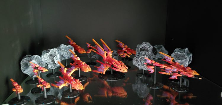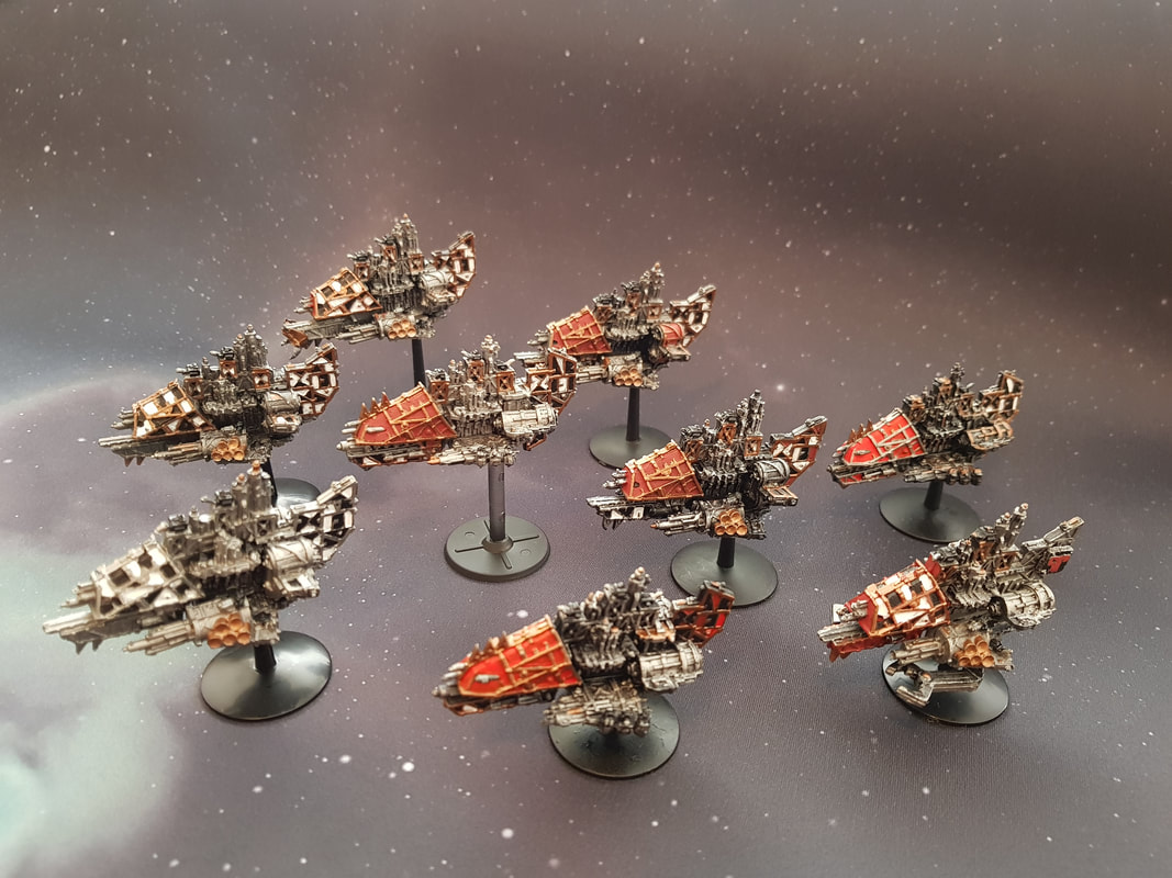 - Custom Ships – This is most pertinent to Tyranids – but the massive amount of 40k bits provide an excellent source to create your own unique looking ships, be they Necron, Eldar, Tau, Chaos, or Imperial. In my experience some of the most fantastic looking fleets have been custom.