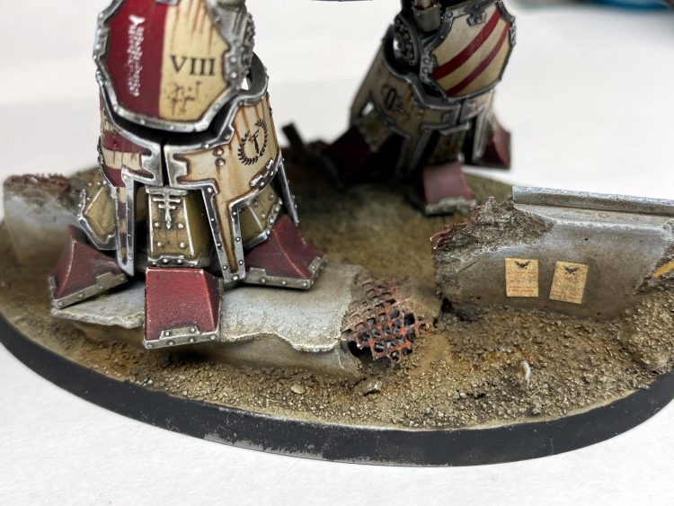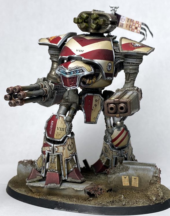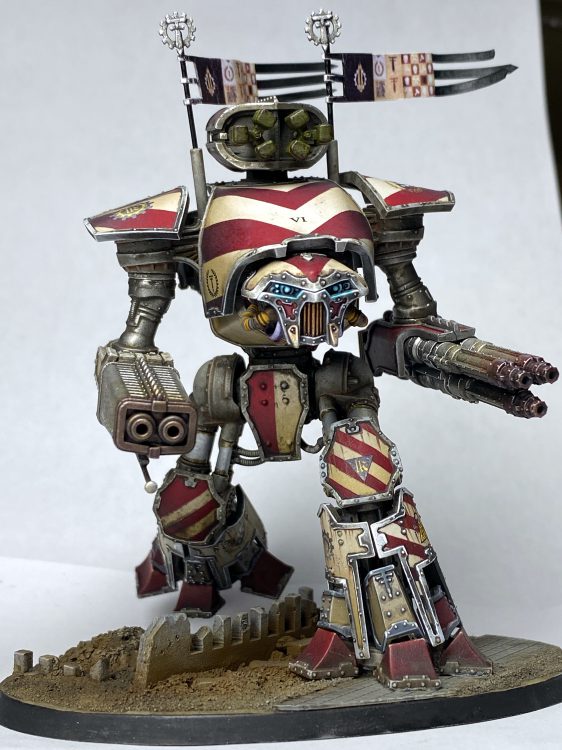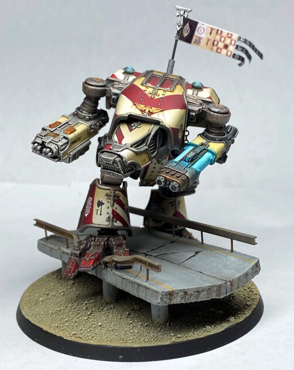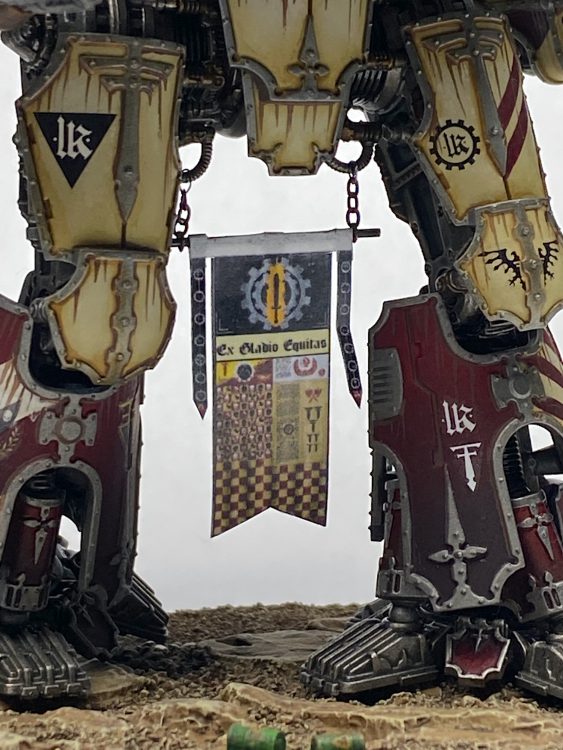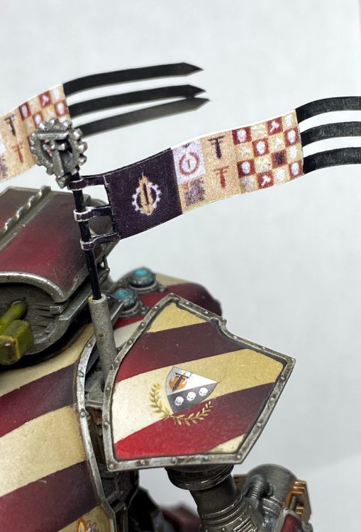 Perhaps the most unusual feature of my titans is the banners mounted on the carapace. The first batch of these were done in something of a hurry as the first (and so far only) AT event at Warhammer World approached in February 2020. I’d added custom banners to my Tau kill team and a Blood Angels marine I’d created for GW Exeter painting competitions the previous year and really liked the sense of movement they conveyed. A square banner seemed insufficiently ornate for a piece of cloth the size of a tennis court flying from the top of a God-engine, so I mashed up some Atarus imagery in Paintbrush and carefully cut out the shapes with a scalpel blade, then wrapped these around a piece of wire in the manner of the sticky-backed banners of mid-90s Warhammer. Rather than glue these directly onto the Titan, I drill holes and insert a piece of Albion Alloys brass tube, blocking the deep end with a blob of superglue so that the banners can be slipped in and out of the tube for transportation. The only downside is having the banners spin around at the slightest breath of air!