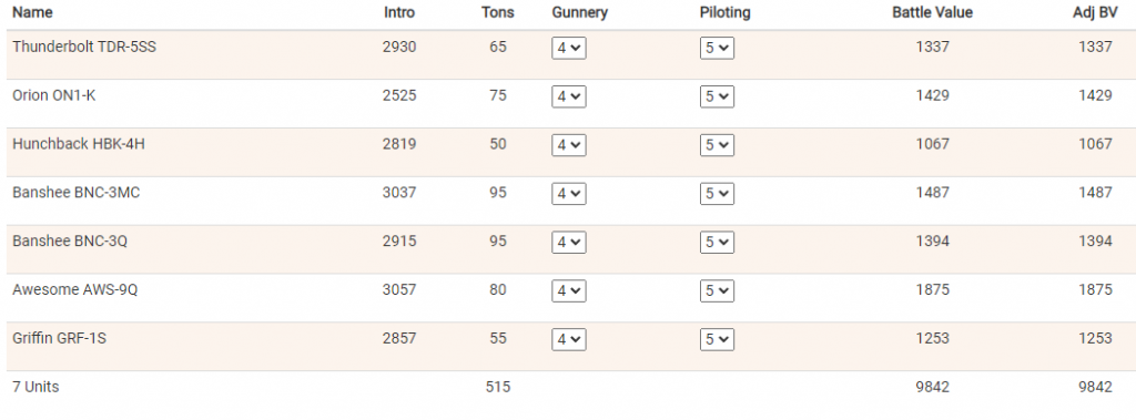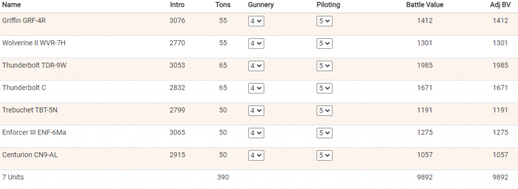 Battletech is a great game, and I really hope that this helped give a bit of an idea what sort of thing your list should even be doing. One of the biggest things that I would take away is that it is very important to make sure that your list stays focused. It can be very easy to end up with a mostly unfocused mess of mechs, and the player with a game plan will nearly always win against the player without one. That applies to all wargames, but Battletech is a game with such a huge amount of units that it goes double here, because there are so many options and so many gameplans you can create. Also, take more Banshee's, Enforcer IIIs, Griffins, and Thunderbolts. Those are just kinda generically good.