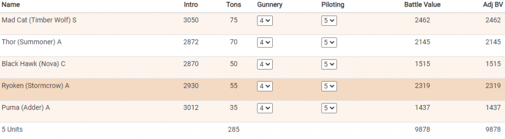 Elites is an archetype defined by a small number of very high tech units, sometimes but not always with higher skill than normal. Generally any Clan force will fall into this, as will ComStar and Word of Blake. Any mech is fair game in an Elite force, but generally mechs costing between 2000 and 3000 are most common. Thors, Mad Cats, Black Hawks, Ryokens, and other Clan Mechs are the platonic ideal of an ideal Elite mech, being fast for their weight and very heavily armed with incredibly good weapons. These sorts of forces can load up with slow assault mechs and try to win just on firepower alone, but generally they are much stronger if every mech is in the 5/8 or 6/9 movement bracket, as this gives them great mobility, and their high tech lets them move that fast and still carry a ton of gun.
