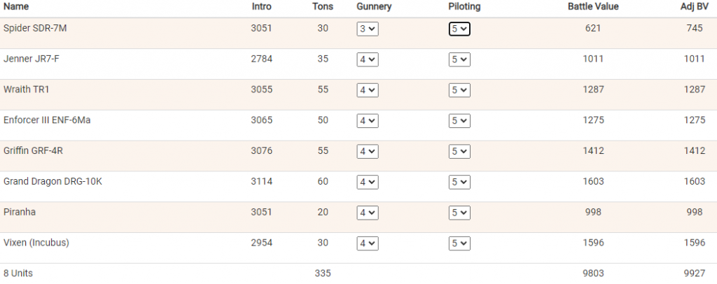 The sorts of mechs and variants that this list wants is very simple. Anything less than 1000 BV, with a movement of at least 6/9. If you are playing without a maximum unit count, I would recommend going mostly for Wasps, Spiders, and Stingers, with a couple of slightly heavier light mechs, like Jenners, Piranhas, and Mist Lynx. Ideal play is using the ultra cheap 500 BV losers to soak shots and fish for rear arc shots, ganging up on enemies and making sure that each of your opponent's mechs is fighting two or more friendly ones, and the more expensive 900-1000 BV losers to finish things off and apply pressure to the enemy. If you have a maximum unit limit, shift heavier, with the bulk of your force being Jenners and other fast 30-35 tonners, with a few fast mediums like the Wraith or Griffin 4R. The playstyle is still mostly the same, with less of a focus on the swarming and ganging up on things and more focus on getting behind things and backstabbing them to death.