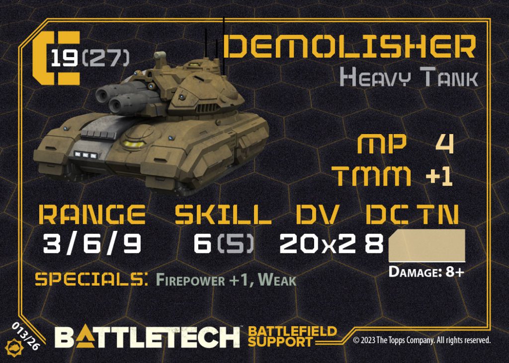 This is a really clever system and will really speed up tank swarms, especially as these rules have cured the issue that plagues vehicles, which is getting tagged for 2 damage and being immobilized the whole game, wasting time with their activation but not being able to accomplish anything. Now an Asset is either at full power or dead, with no need to track the steps in between. This is mostly a good system, and does a better job than the old rules of representing the Battlemech as the king of the battlefield, as under standard Total Warfare rules vehicles generally have a bit of a lead on mechs when it comes to combat due to their much, much lower BV cost letting you get many more guns for the same price.