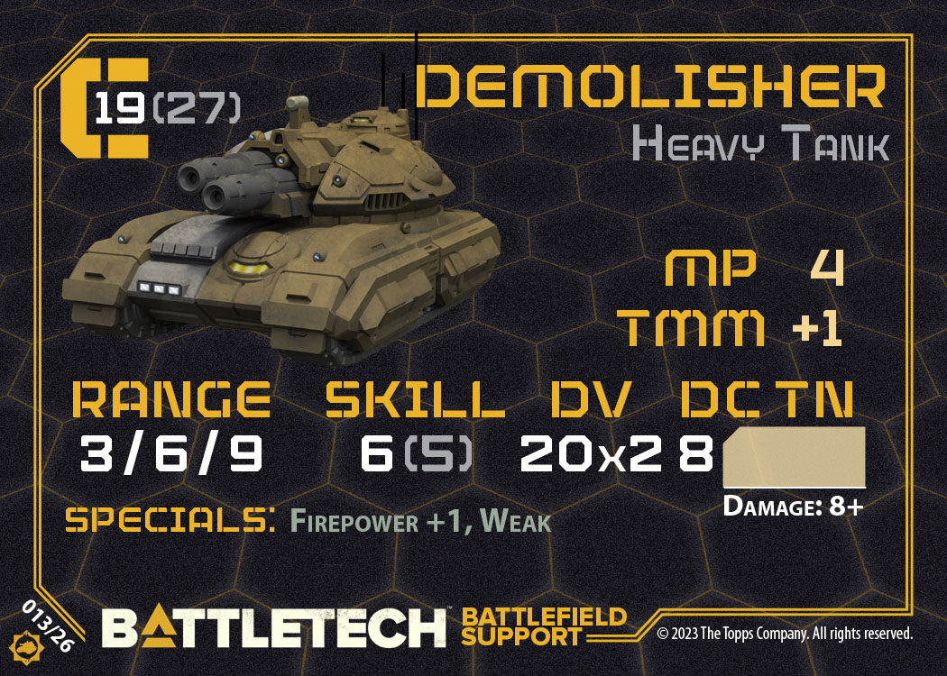 Each non-mech unit, which the rules call Assets, has a card similar to an Alpha Strike card. It has a variety of stats on it and it seems as though the ones that come in the kickstarter will be dry-erasable, which is very nice. Each non-mech has been crunched down beyond belief, with no health or armor and a single flat damage value. Each Asset does a set, single amount of damage, possibly in multiple groupings, and has a single range profile, rather than having separate weapons. This is a pretty elegant way to solve the "I need to make 40 hit location rolls for my SRM carrier" problem that can happen with the conventional vehicle rules. They also have a flat MP and TMM, similar to an Alpha Strike mech, so they are always the same difficulty to hit regardless of their movement. The most interesting part of the cards, and of these rules in general, is the way they take damage.