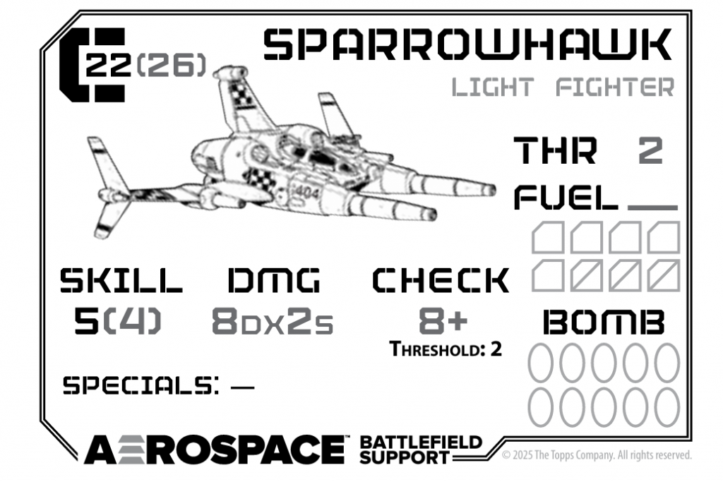Fuel is a vital attribute, giving a hard cap on the number of turns the aerospace fighter can operate in the vicinity of the fighting on the ground. Aerospace assets do not have to be deployed at the start of the game, however; aerospace assets with limited Fuel can wait for a window of opportunity before committing to the field. Fighters can’t come and go to nurse their fuel - once they’ve deployed they’ll stay deployed - but underwing fuel tanks are one of the options for external stores, and external tanks are always expended first (so that they can be dropped). External fuel tanks do have a BSP cost, however, scaling relative to the cost of the asset itself; this can reach costs as high as 8 BSP per tank for the most expensive Clan fighters.