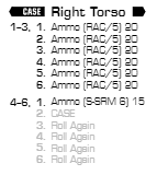 There are 7 explosive crits in this mechs right torso and nothing else. This is the ammo bomb to end all ammo bombs. That is also all the RAC and streak ammo in the mech, so a single crit to the right torso knocks off the torso, an arm, and silences the guns in the CT and opposite arm. This is the second worst side torso in the game. The Marauder 3Rs is the worst simply because it doesn't have CASE. A TAC to the right torso dunks this mech into the center of the fucking earth. Who did this, who are you, what is your destiny?