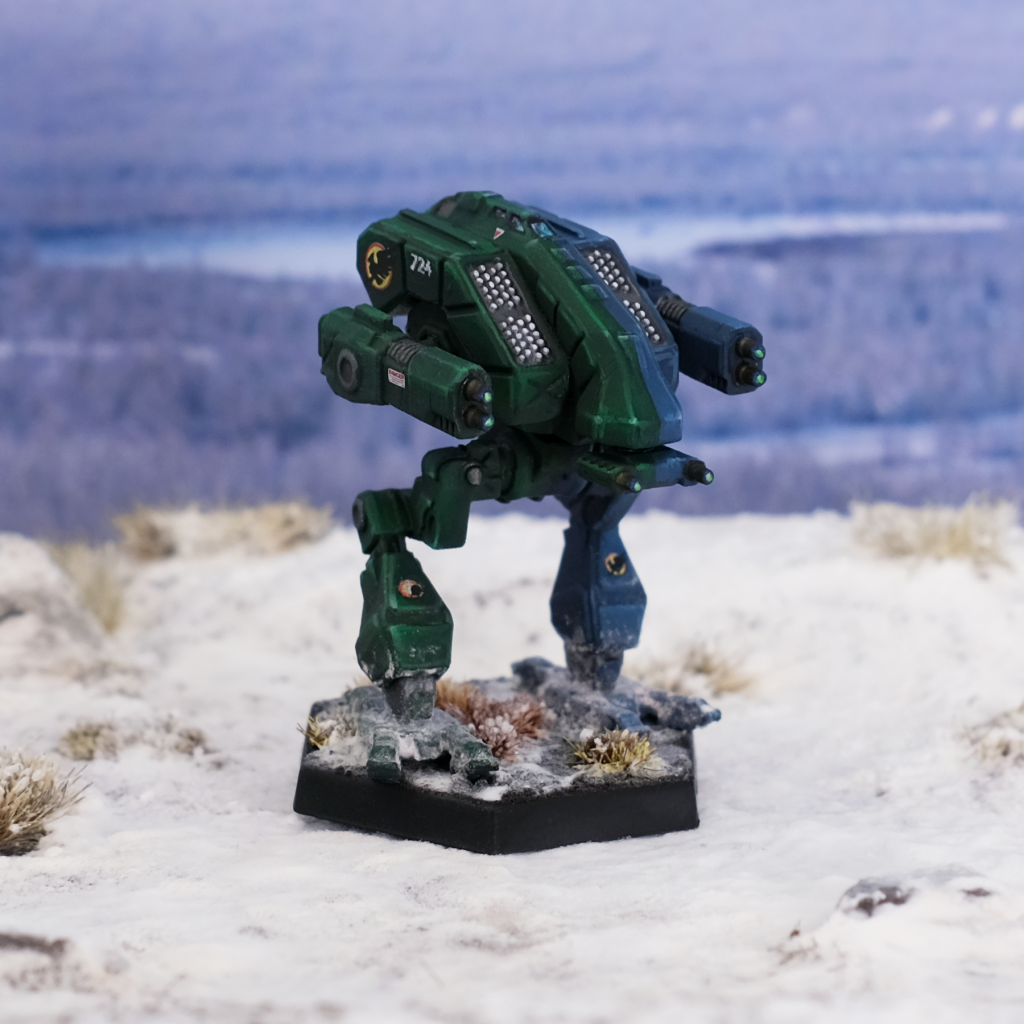 “What if the Spider was a quad?” isn’t a question that I’d think to ask in a vacuum, but the Tarantula provides an answer anyway. The outcome is a ‘Mech with marginally better armor coverage, worse overall survivability, double heat sinks, and a Streak 2 in the CT, but you lose the ability to torso twist and punch things. However, retaining the 8/12/8 move profile while moving to a quad chassis opens up some interesting tactical options with pure ground movement by providing plenty of MP to take advantage of the side-step maneuver. As a model, the Tarantula is fascinating, having been sculpted as a dedicated manspreader – the model itself comes with multiple platforms you’re meant to put onto the base for the feet, extending its profile well past the confines of the hex. I personally think it looks really cool, but I’ve seen some people bend the legs inward to try and get it to actually fit on its own base instead of invading others’ personal space.