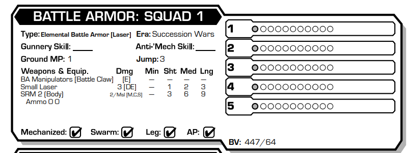 Battle Armor record sheets are a little different from mech ones. Basically, each member of the unit is equipped with the weapons on the left side. They cannot run and are stuck at one speed, though they don't take a penalty from jumping and have no reason not to jump. Their overall health is on the right, with each trooper having a bar. All incoming damage hits a random trooper, so they tend to spread damage around. An Elemental has 11 health, 10 in the form of armor, and 1 representing the squishy, fleshy trooper inside of that armor. This is an annoying break point, because it means that most IS grade heavy weapons will come 1 point of damage short of killing one, and even most Clan grade weapons will come up 1 to 4 points short of a kill. They come in squads of 5, which is 55 total health. On top of this durability, they can jump 3 hexes a turn and have an innate +1 to hit penalty due to their small size. This means you are basically always going to be at a +3 to hit penalty when firing at them, which makes them annoying to hit and, comboed with their armor hitting a perfect breakpoint and their innate damage spreading, makes them somewhat of a nightmare to kill.
