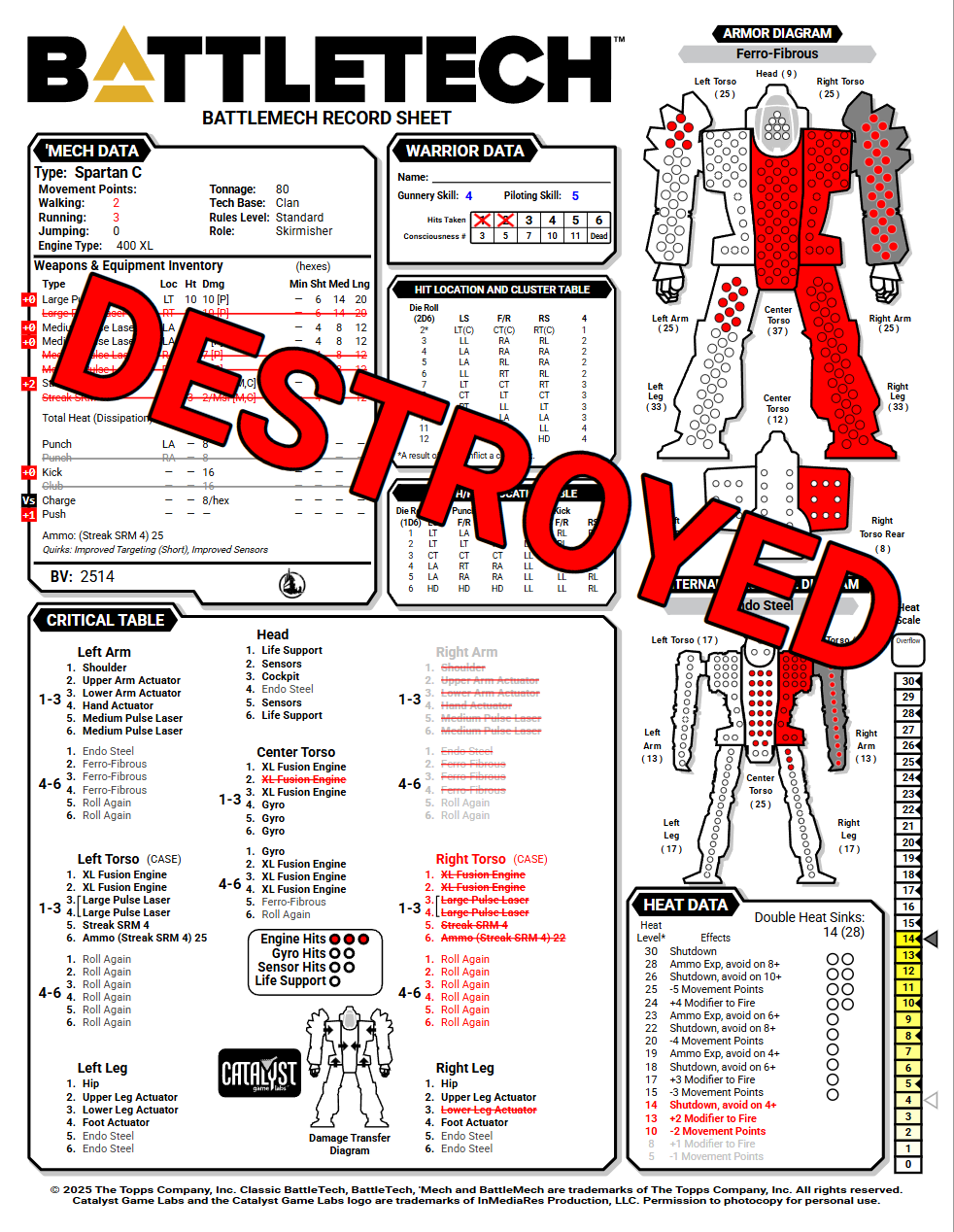 If you take a look at this record sheet you can see a common theme across all my games - mechs die by having one side completely ripped off, while the other side is nearly untouched. It was reliably happening in 1-2 fewer turns of shooting than what I'd expect based on previous experience, as there was very little damage that ended up being wasted into other locations.