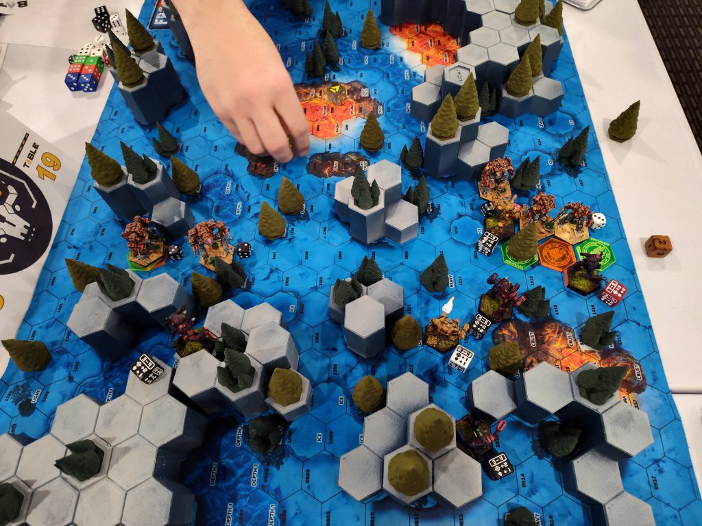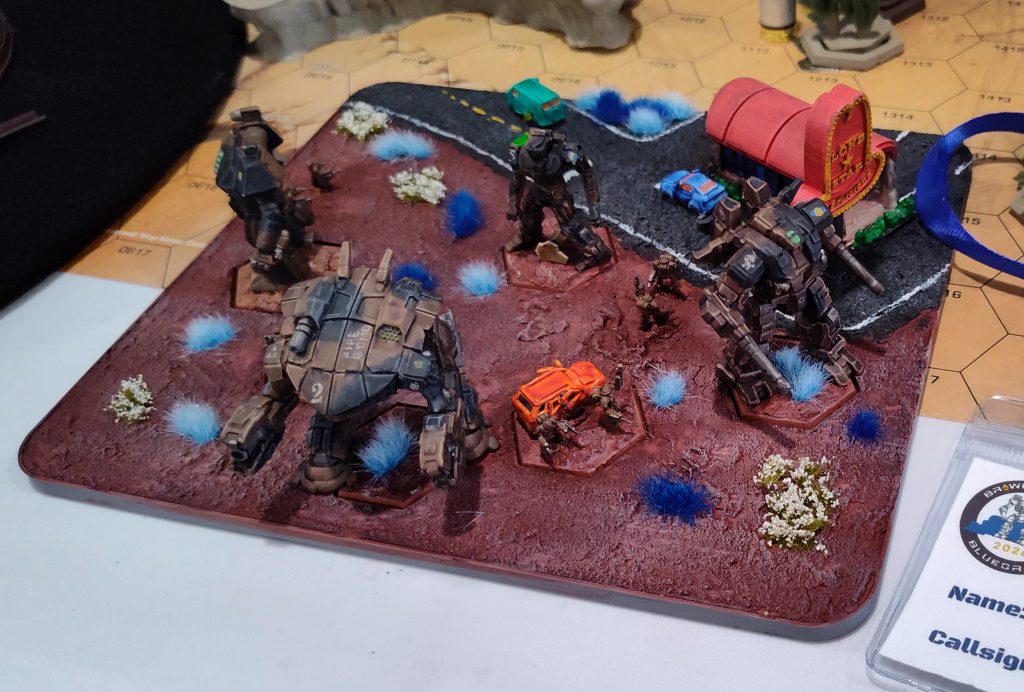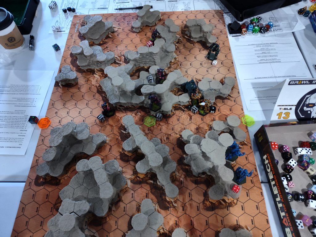 Sportsmanship scores were a bit of a miss here, since they were written on a shared scoresheet in view of your opponent and thus almost everyone scored perfect 10s because no one wanted to be an asshole, but that’s definitely a known and acknowledged issue. I don’t want to bang my speed-of-play drum too loudly and monotonously in these articles, but I do think BattleTech would benefit from… I’ll say an evolving understanding of sportsmanship. I think we’re pretty good as a community at the baseline “don’t be a dick, approach the game in good faith, accept correction when you make mistakes” kind of stuff, but I think people are less conscious of what they can do in their own prep and their own gameplay to make things easier on their opponent. Reviewing the rules for equipment you’re bringing in advance. Making sure you have the necessary supplies. (My first round opponent had neither a pencil to mark his sheets nor any cluster tables aside from the ones in the back of Total Warfare, which he hadn’t opened in advance despite having ATM-9s and LRM-20s as the primary armaments on two of his mechs.) Making sure player-facing information is complete. (Neither my first round nor third round opponent had written their Gunnery and Piloting skills into the blanks on their sheets.) Putting clear markings to indicate facing on ambiguously-posed mechs’ bases. (My first round opponent had a King Crab in a full torso twist with no base markings to reinforce the fact that its feet, not its torso, were pointing forward.) Promoting clarity in the use of TMM dice. (I overheard discourse at a neighboring table over whether or not a Battle Armor unit’s TMM die included the +1 for being a smol target, for example, and I’m sure all of us have played against that guy who has a completely different color-coding system than the default CGL’s onboarding material promotes.) Streamlining play where possible. (For example, there’s no functional reason why my third round opponent couldn’t have at least rolled the Iron Cheetah’s Gauss and ERPPCs together against any target from 3-14 hexes away, other than the Reflective Armor Ostroc, since they’d be doing the same exact damage on the same exact numbers.)