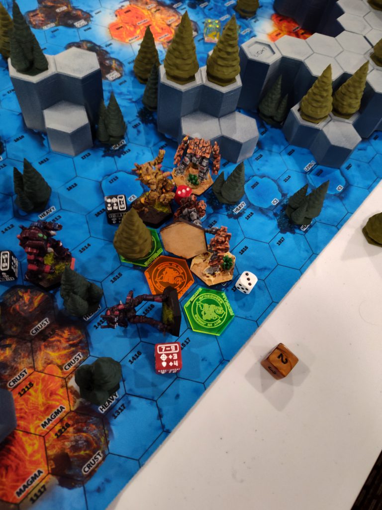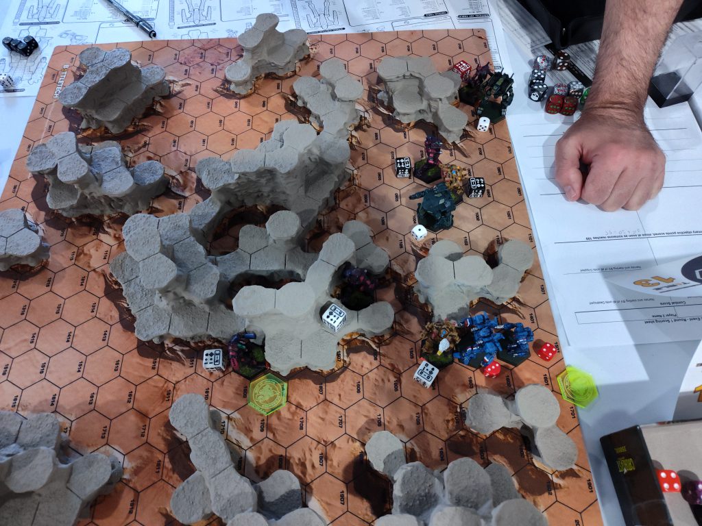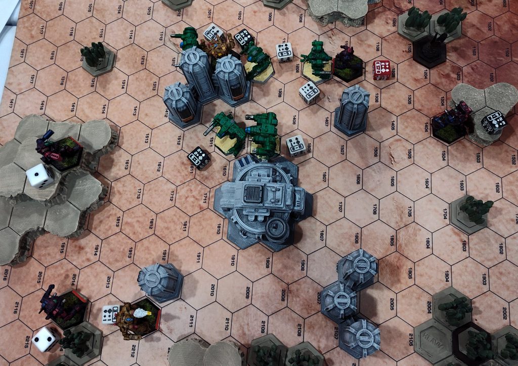 We were on one of the blank “FieldTech” maps with some fairly sparse 3D terrain placed atop it. There wasn’t anything on the bottom of the FDM pieces to increase their traction against the neoprene, and no markings on the underlying map to indicate where terrain was supposed to be, so I fear a couple of the plateaus may have migrated a bit over the course of this game.