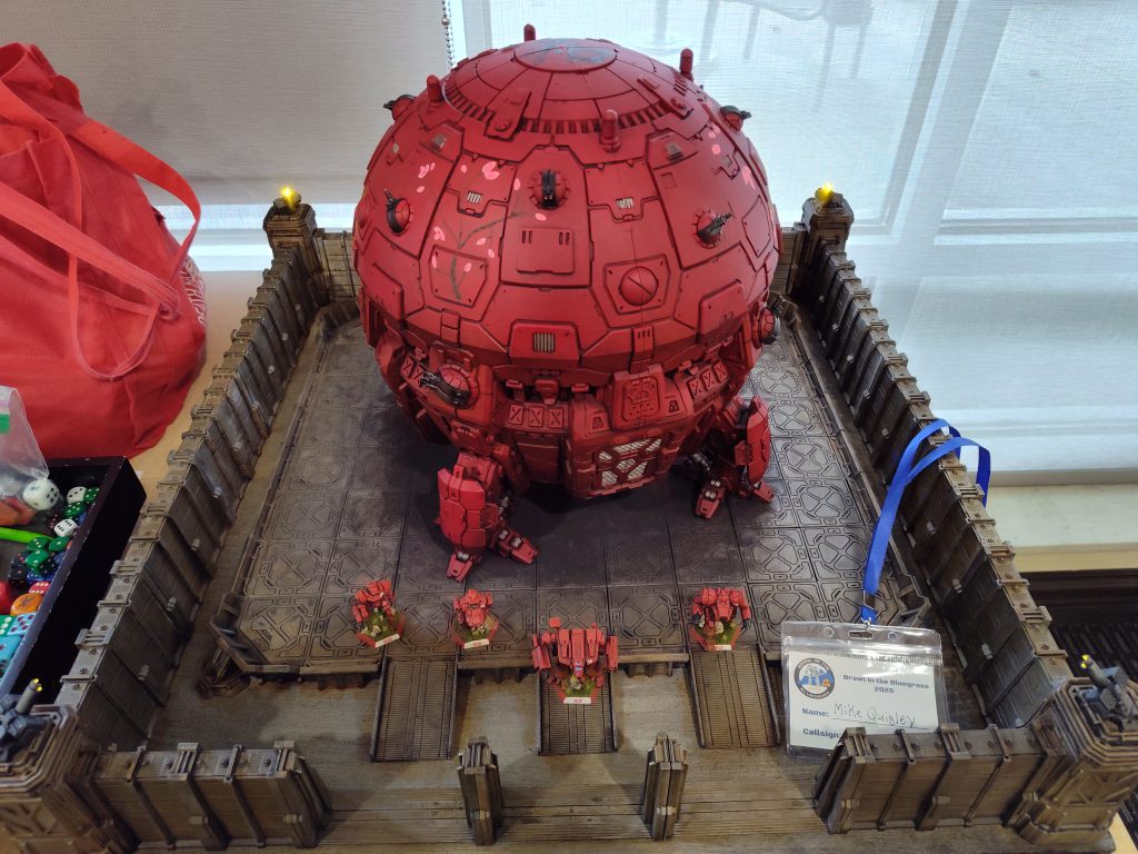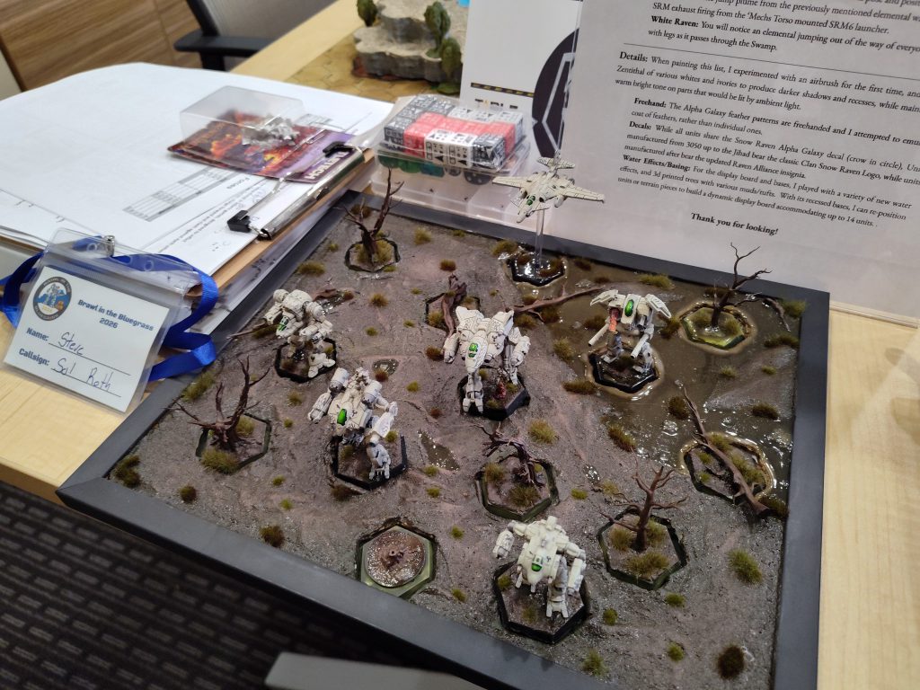 Massive respect to TO Tweezer for organizing an event on this grand a scale and having it run as smoothly as it did, but I do hope incoming TO (and reigning champ) Vapor continues to iterate on this foundation. The TOs handled all the BV math for killed/crippled combat points in this tournament, which I understand as a safeguard against players doing the math badly and for speeding things up on the player-score-submission end, but something about either that step or the formulae underlying the pairing process made every round’s pairings after the first get posted late, and made the final rankings run a bit late as well, which contributed to the “time crunch” feel of the tournament. Also, like at Southern Assault V, the TOs really seemed to bite off more than they could chew when it came to paint judging timelines. If you need to make the lunch break longer, just make the lunch break longer, or maybe divide the labor differently (something like the system Atlantic City Open will be using, perhaps, where a quicker-to-judge basic rubric winnows the field so the judges can focus most of their time and attention on the top cut).