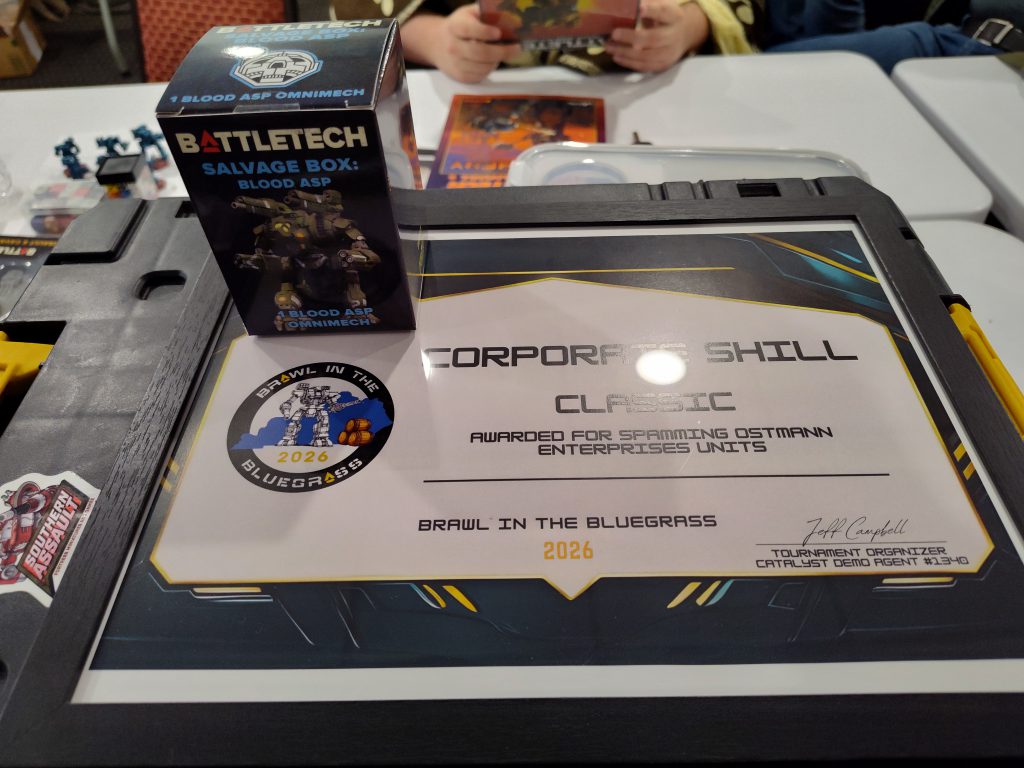 My road to the “Brawl in the Bluegrass” Classic BattleTech tournament, hosted at a hotel in Lexington, Kentucky on March 7th, 2026, started with the announcement of the Illician Lancers Command Lance. “Huh,” said I, “once that releases, there will be six unique sculpts of ‘Ost’ mechs, an Ostscout, an Ostwar, and two sculpts each of the Ostsol and Ostroc. You could fill a whole tournament list with them!”
