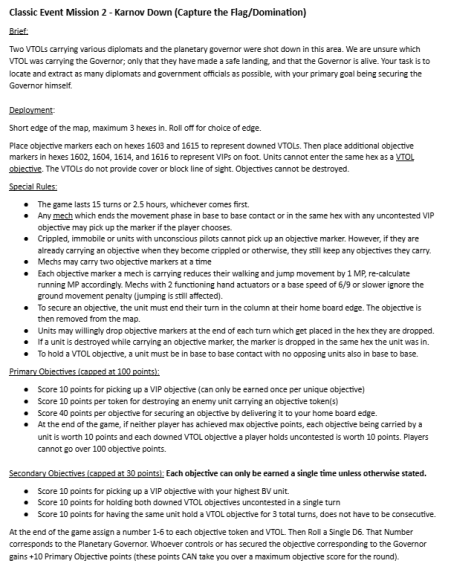 "Karnov Down" is an MRC-favorite mission, but it's more commonly run in Alpha Strike, and while I'd heard the name, I'd never actually encountered the mission before. I felt very left-out-of-the-in-joke when it was pretty much introduced with a "You all know what this means!" Between the tacit assumption that we were familiar with the mission already and the continued lack of any Q&A time, I felt particularly ill-prepared for this game.