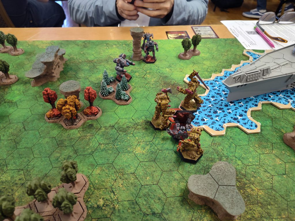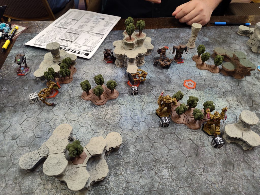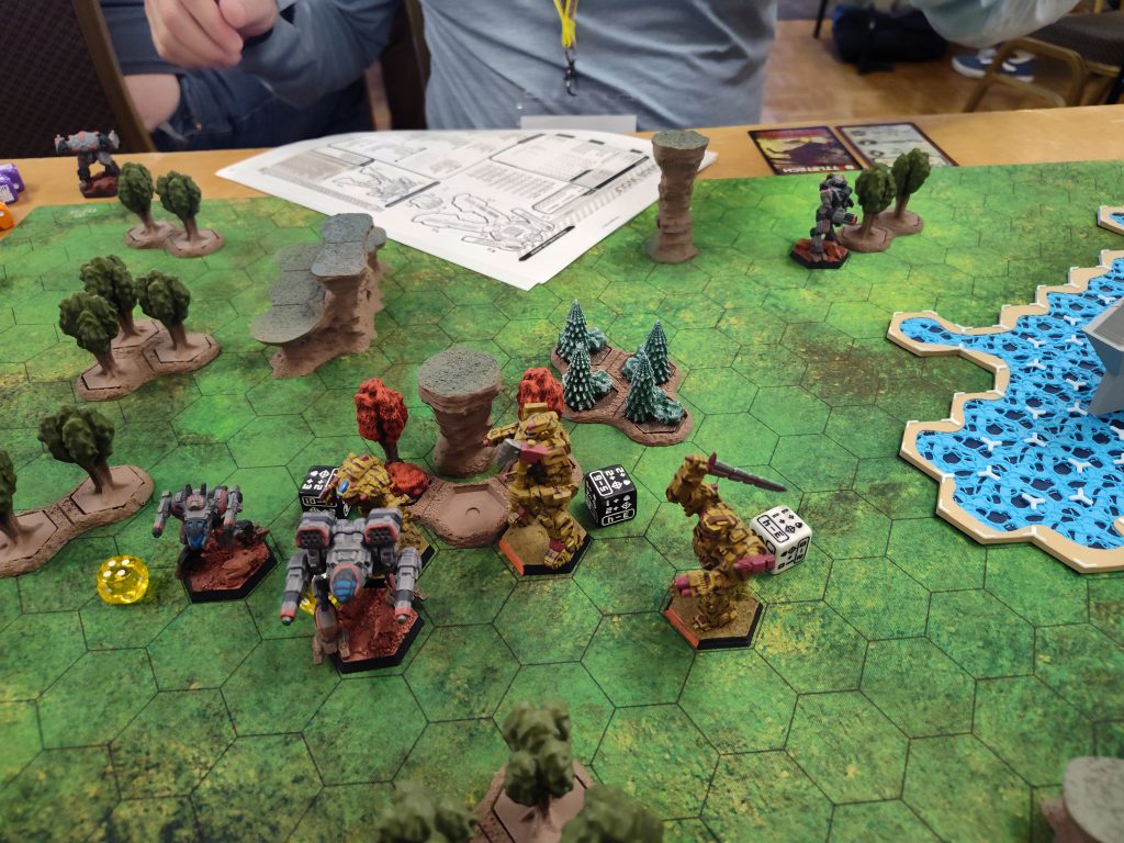 Once again I need to commend my opponent, Ando, for the enormous patience he showed me. I was not only still frazzled coming into this round, I was initially thrown off balance by the communications barrier between us, as he’s a Deaf person. He was extraordinarily well prepared in terms of communication tools, but I’m afraid I wasn’t the fastest to pick up on the cues he was giving me. In particular, I struggled getting the right damage associated with his attacks when recording his hits; this shouldn’t have been a problem at all because he’d given me copies of his record sheets with his consistent dice-color-coding for every weapon included, but I was dense enough I didn’t realize that they were double-sided until after the game was over and was simply befuddled as to why he’d handed me copies of the sheets for half of his mechs. Whoops.