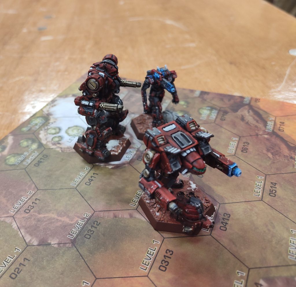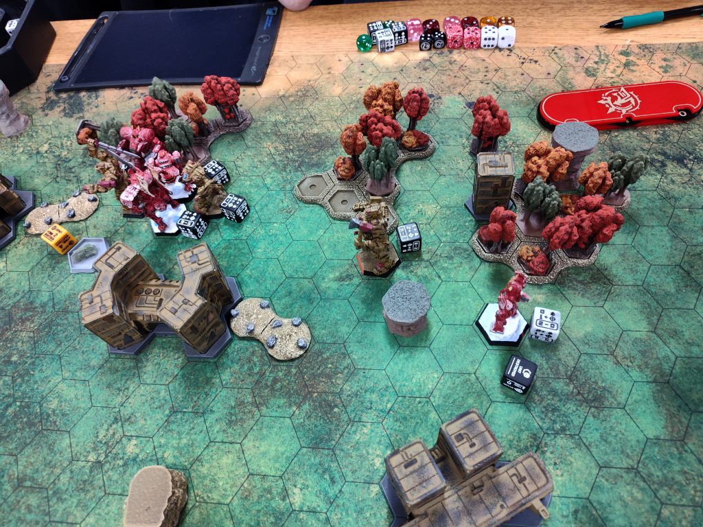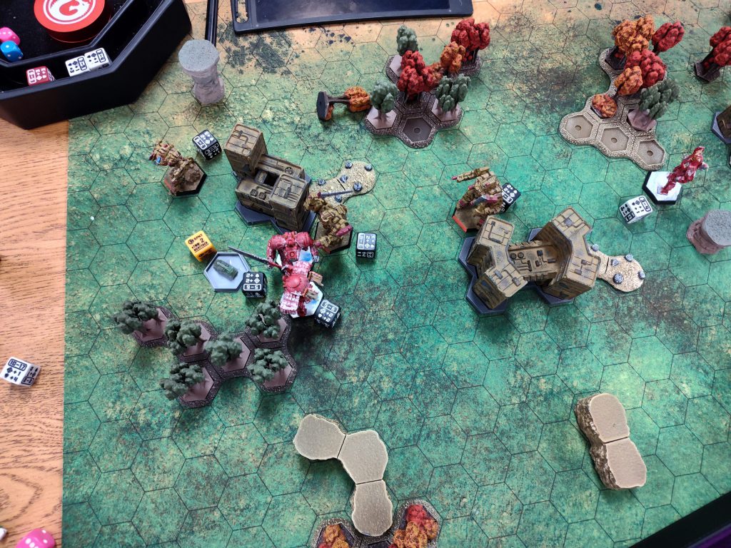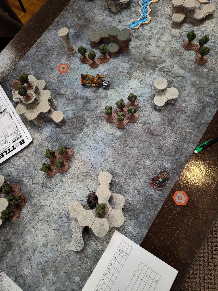 The mission here was a variant on the same concept WarZone Atlanta ‘25 employed for “Operation Sumo,” but with some tweaks, most of which I liked. The mission was to push a line of four objectives, but rather than an all-or-nothing approach, each objective could move independently, with endgame scoring based on how far each was pushed from its starting point, and a bonus for each objective pushed off the opponent’s deployment edge. Mechs had to be directly on top of one of the objectives, conscious, standing, and not shut down, at the end of the heat phase in order to displace it. The objectives were displaced further the larger the controlling mech, from one hex for light mechs up to four hexes for assaults, or half that distance (rounded up) if the controlling mech was crippled.