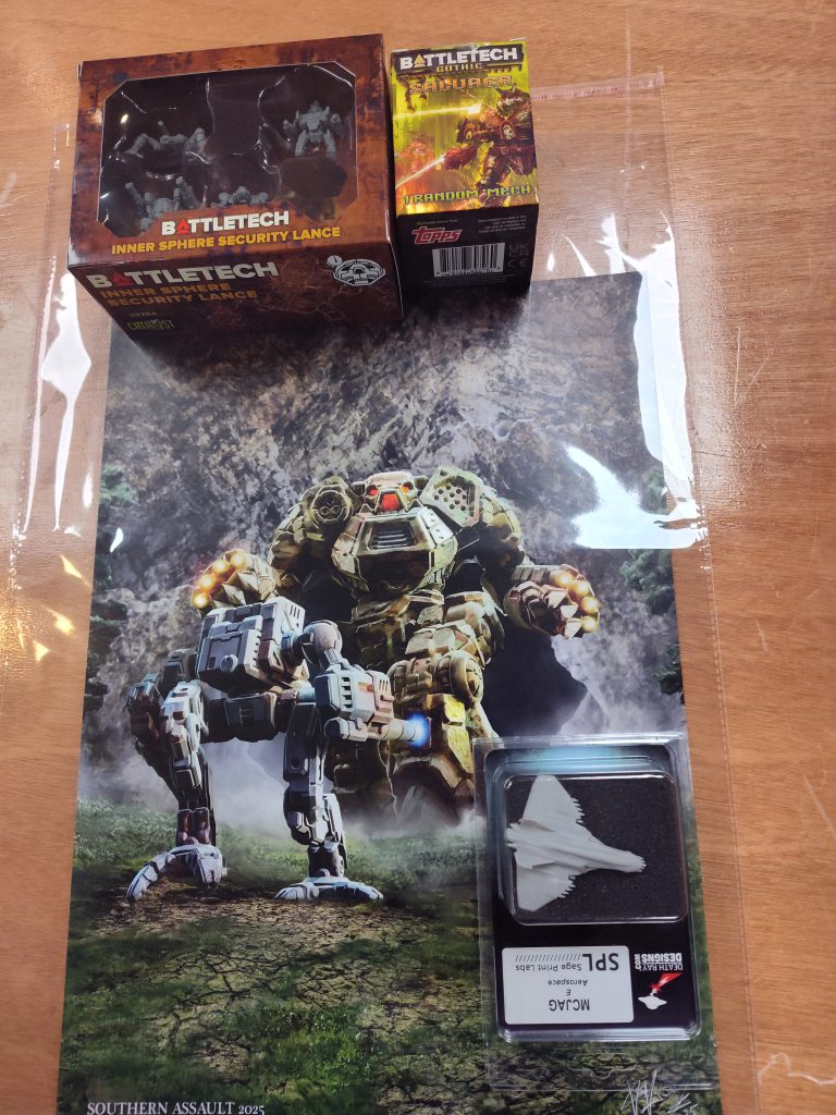 I got rather… diverted after that first round. I wandered over to check out what Fortress had for sale: a mix of old oddities (including vintage BattleTech model kits and Unseen minis!), recent exclusives (including the Fox Patrol dice pucks, which strongly tempted me), clearance products (like the pre-Fanatics Army Painter line), second-hand and imperfect merchandise, and various other hobby paraphernalia, all at deeply discounted prices. I got very engaged in shopping, and only really remembered that I was on a 45 minute lunch break in the middle of a tournament when pairings started being announced. It was time for…