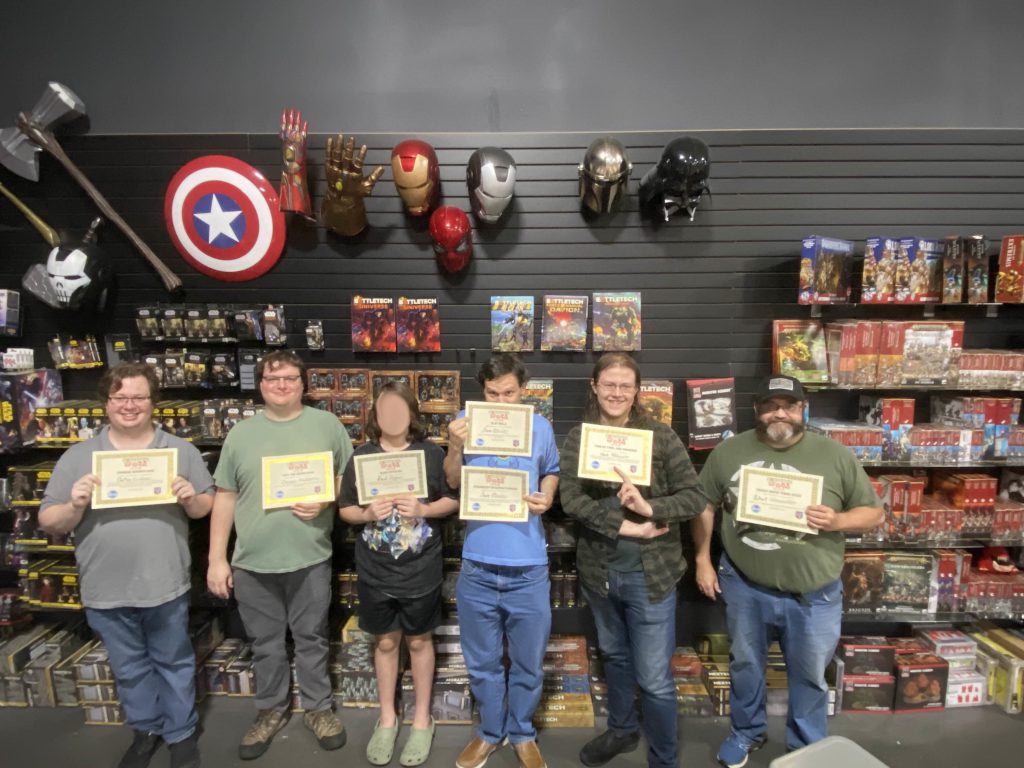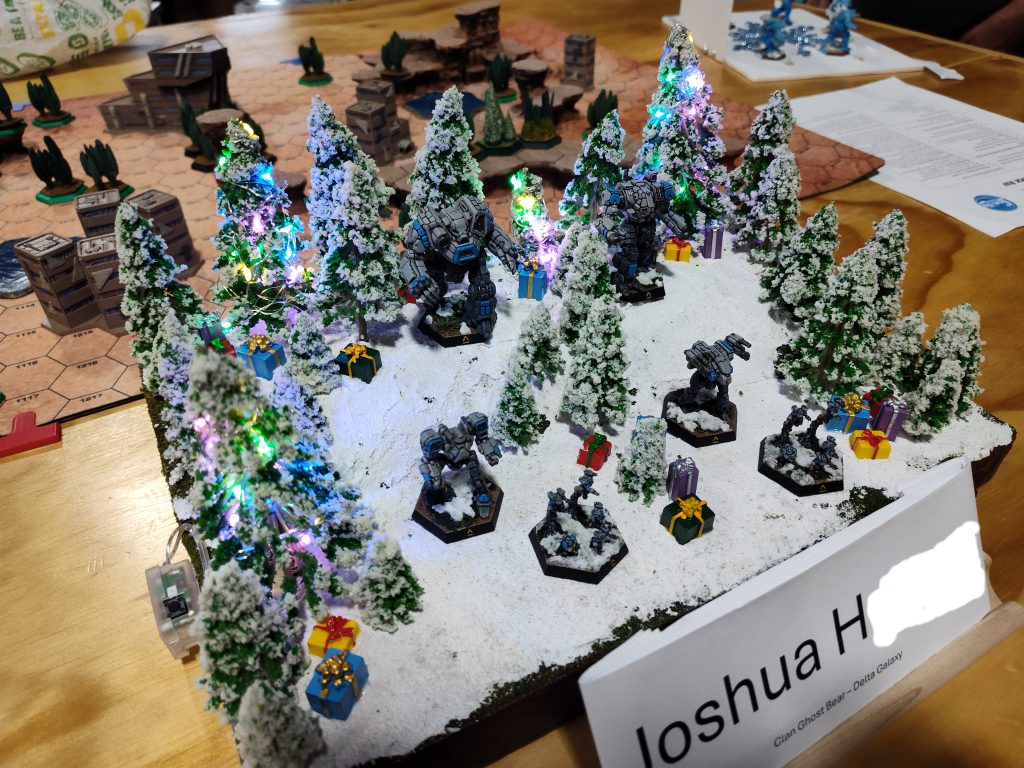 The commemorative certificates included the usual suspects, like the wooden spoon (“Didn’t Hear No Jingle Bell”), good sportsmanship (“Heart Grew Three Sizes”), etc., and acknowledged some mission-packet-specific achievements (like a certificate for the player who scored the most feats of strength for secondary scoring, which very much went to ChahDresh), but also acknowledged some more unusual circumstances. Though the packet allowed anyone to take one in their list, only one player actually brought a Unique mech (Hohiro Kurita’s Dire Wolf config), and he got a “Unique Snowflake” certificate out of it, for instance. Another player earned “Two By Two, Like Reindeer” for taking a pair of the same ‘Mech chassis and also a pair of the same vehicle chassis (two Crusaders and two Manticores in a Lyran list). No prize for using 8k BV exactly this time around, alas (likely because I wasn’t the only one who did it)