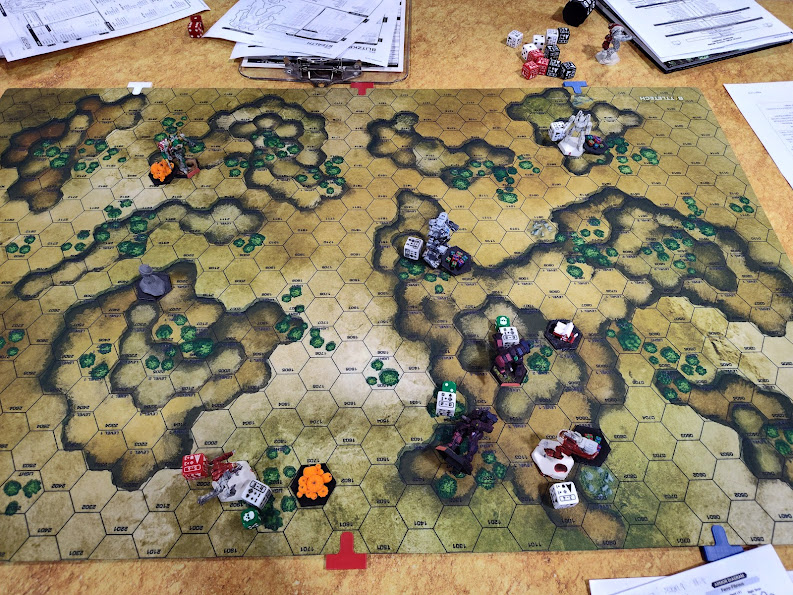We were on the lunar battlemat for this round, and I’m EXTREMELY pleased to report that my complaint from Summer Fever was noted and the added 3D elements all had their hexes delineated this time around.