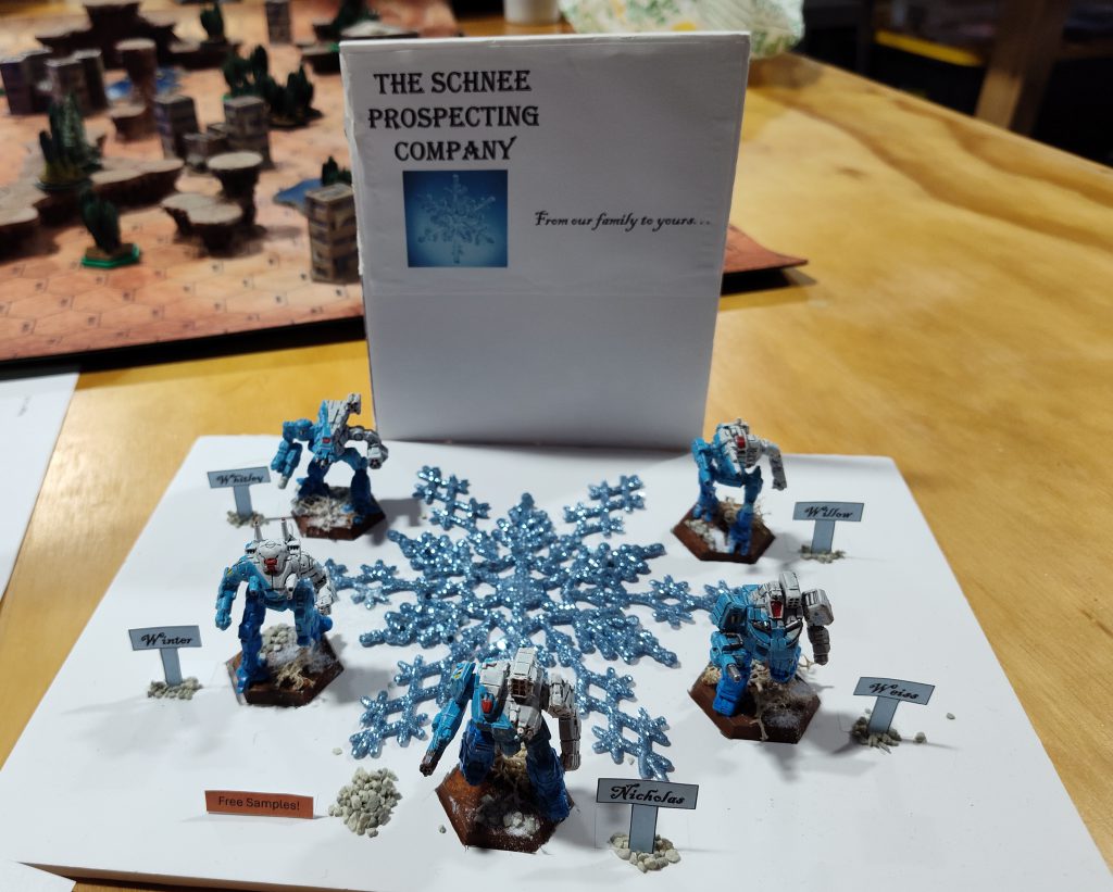 theme. He’s the player who paints all his Inner Sphere ‘Mechs with RWBY-inspired colors based on their Alpha Strike Roles, and he decided to go all Schnees for Toys for Tots due to the Christmas theming, since the founder of their family in the show is a Santa Claus expy. The upshot of this is that he limited himself