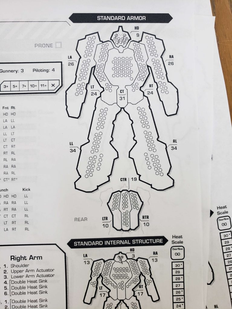 This is a photo of a record sheet for an Awesome AWS-9Q, a 1875 BV Assault mech that I had upgraded to a 3/4 pilot for a total cost of 2475. It died to the first shot fired in that game to a random gauss rifle. I generally play 10,000 BV games, so that was a full quarter of my points going off the table to random chance. I have also had a game where an Adder fired it's head mounted Flamer and one shotted another AWS-9Q with a ridiculous through armor critical that hit the Gyroscope twice. Battletech is a game where you really, really don't want to sink all of your BV into a small handful of mechs.