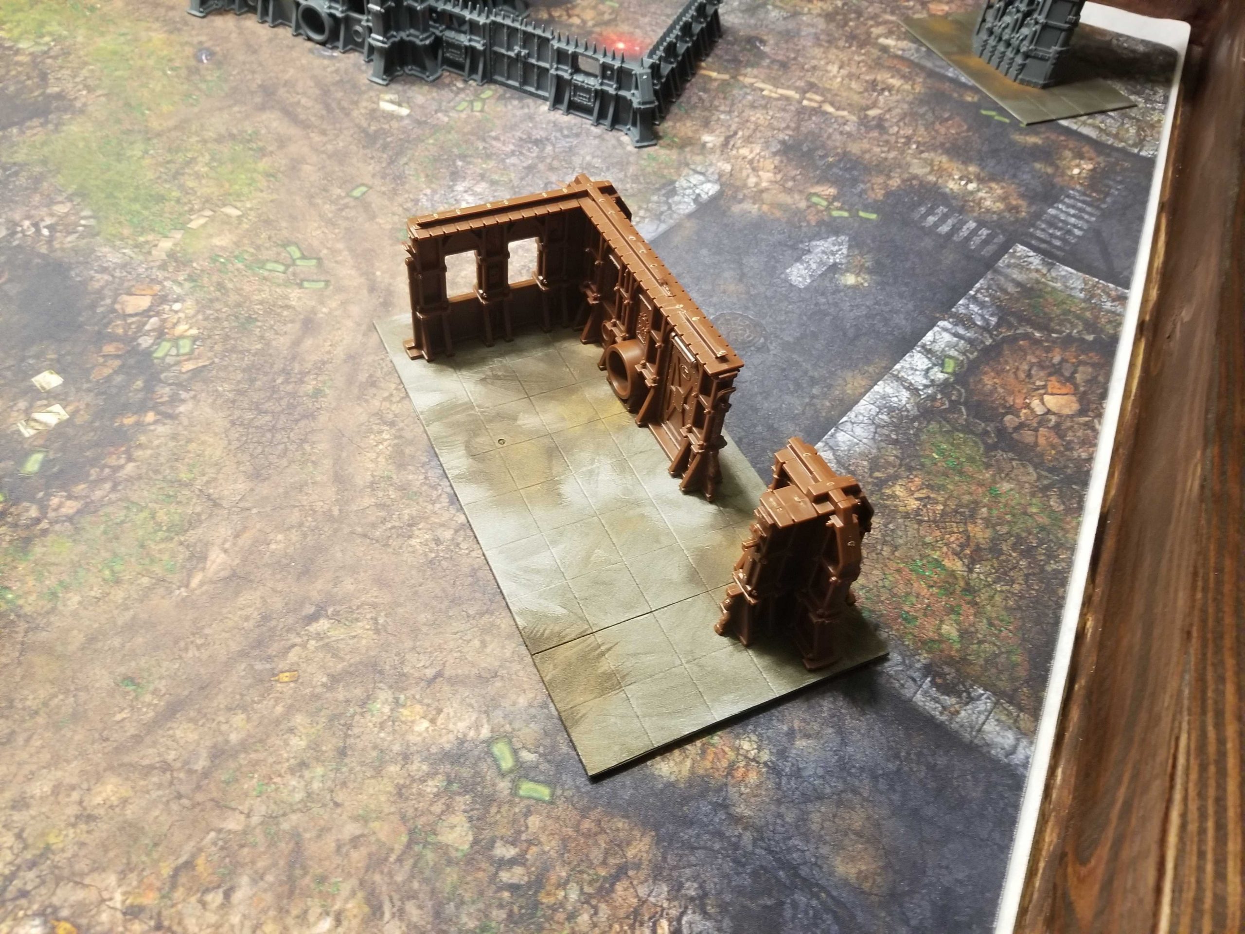 That gives you a semi-varied, symmetrical battlefield to play around, and should do fine for smaller games. I'd probably turn the fronteris buildings 90 degrees, depending on the mission and deployment map, to maximize players' ability to hide units.