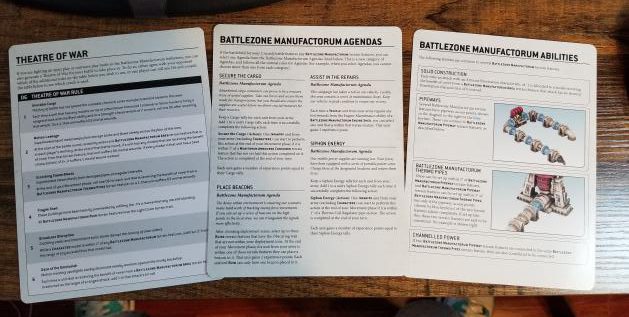 Finally we have the three Battlezone cards. These define the Battlezone Manufactorum and how to play with it. It's worth noting that all of the terrain datasheets above except the Munitorum Armoured Containers have the BATTLEZONE MANUFACTORUM keyword, meaning they can only be used on this battlezone, and only they can be used with it if you're doing Tactical Deployment.