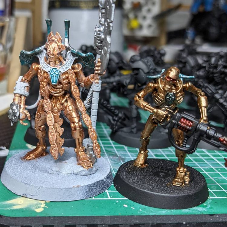 Painting-wise for the 'Crons, I was after a Bronze/Copper look but I certainly wasn’t interested in paying $50 dollarydoos for the Runelord Brass undercoat from GW. Instead I crowdsourced some advice from the incredibly cool, smart, talented, probably attractive people found on the Goonhammer Patreon Discord and was pointed in the direction of the Vallejo Air Copper by Magos Sockbert. And I’ve been very happy with the results on my test models so far.