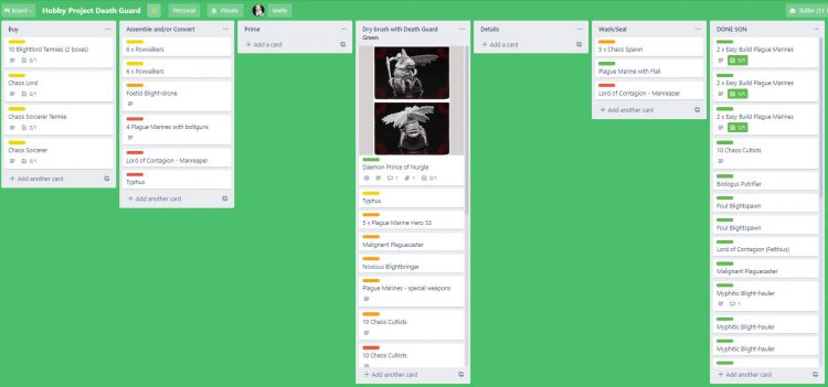 My Death Guard project has almost slowed to a halt, Steeve the Daemon Prince finally arrived and I’m slowly smooshing him now. But once he’s done I’ll be taking a break from my little Green Nurgly Chaps so this Trello project will be on hold for now