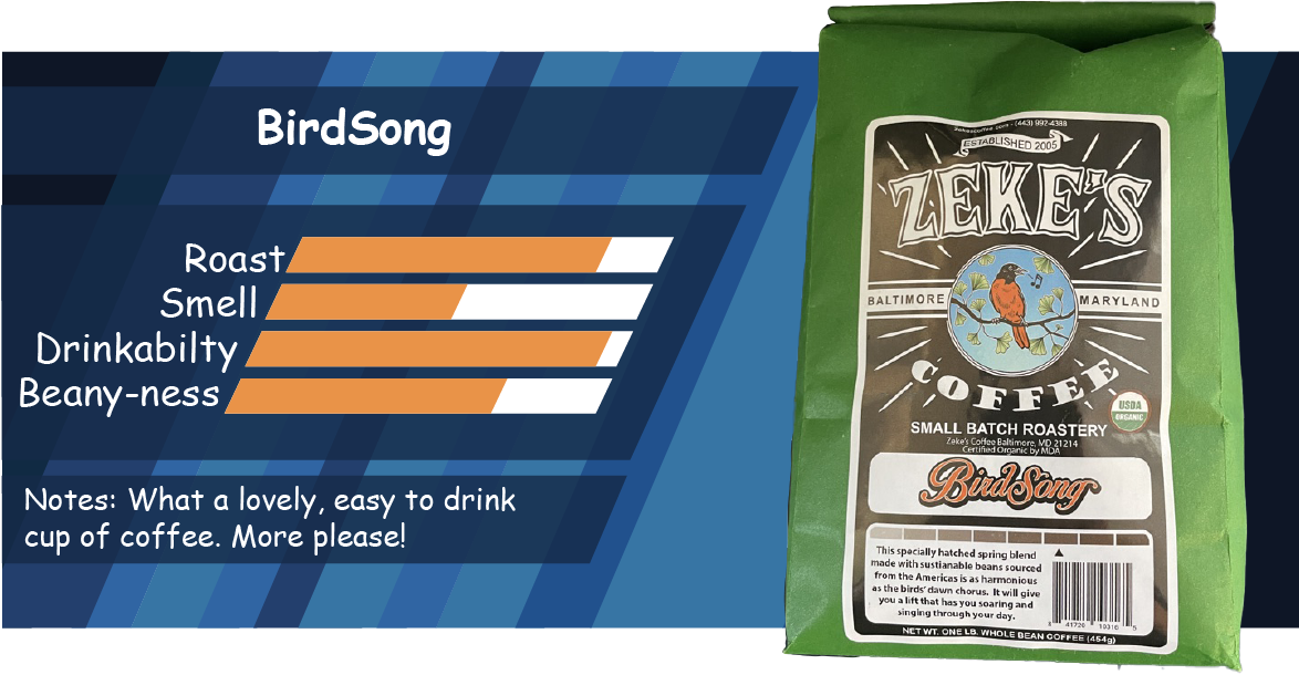 Birdsong. Another blend, this time a mix of Central and South America beans. I didn't adjust any settings from how I brewed up the Hippie blend, so wasn't expecting much form my first brew. First sip, DAMN, this is a solid cup of coffee... SUPER smooth and pleasant. Leather on the nose, dark chocolate throughout and cocoa on the finish. Last sip; dark chocolate covered almonds. I will be brewing this for the rest of the week.