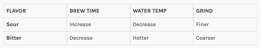 *Your grind will change based on your beans, roast and the age of the beans. I found this great little chart to dial in your brews and refer to if often when trying different coffees: