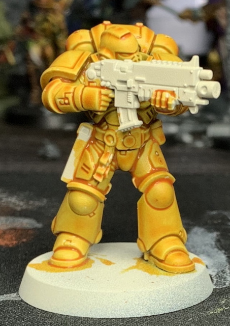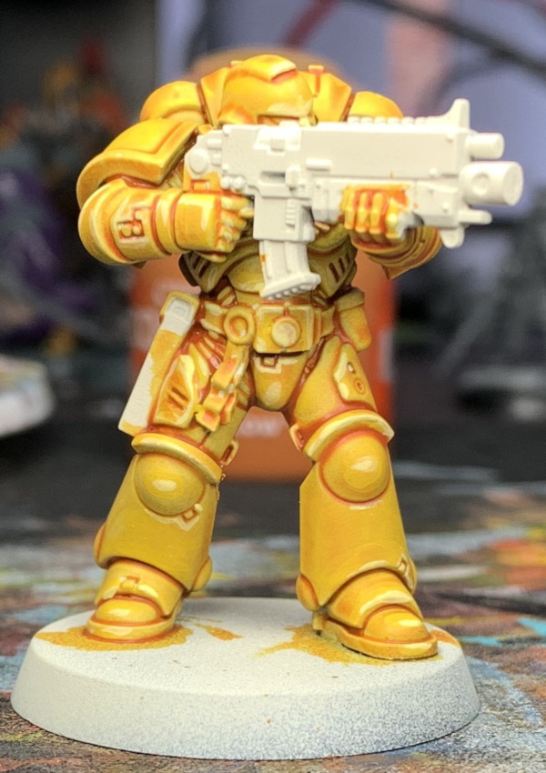 Now take some thinned Dorn yellow aka the paint formerly known as Edge and apply it on the sharper edges of the model and anywhere you want to simulate light hitting. Like this: