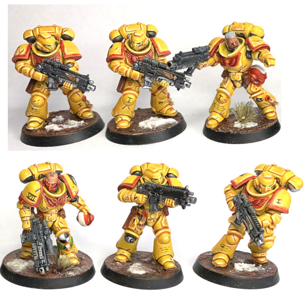 Eye lenses are Warp Lightning Green (Contrast) with a dot of white at the back, and finally the same white was used as a couple of spot highlights over the Dorn Yellow from the previous step. Do this 6 times and you'll magically get a unit and a HQ just like this: