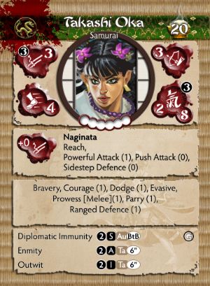 Takashi Oka. She is described as the Dragon Clan’s ambassador and envoy to the Imperial court but last edition her Ki Feat was Seduction and all her abilities seemed to be about avoiding melee and jumping about. I think she’s a really interesting profile now with Ki Feats representing her role as an elder stateswoman and a senior member of the clan.