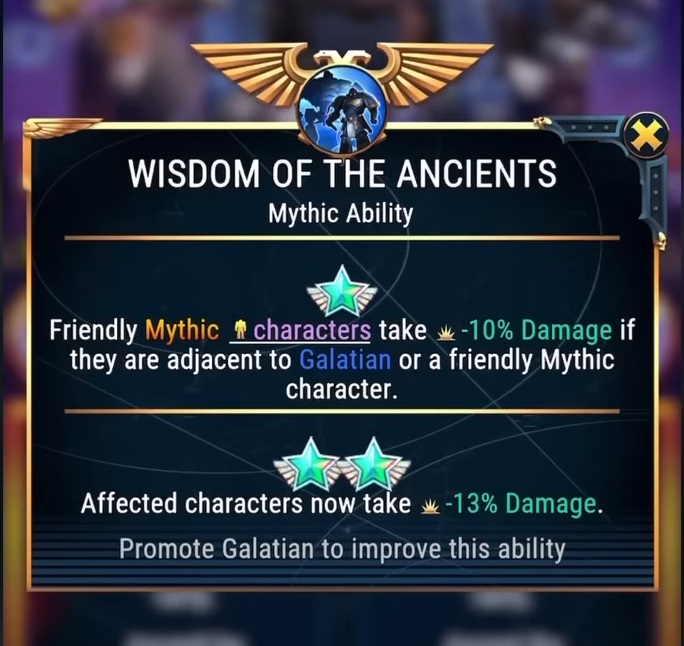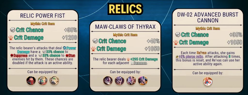 too often, but it's something to keep an eye on. Oh, and when Mythic characters are downscaled (i.e. in Guild War, Tournament Arena, and other rarity-capped modes), their Relics lose their unique ability... which is sad, but probably necessary for game balance.