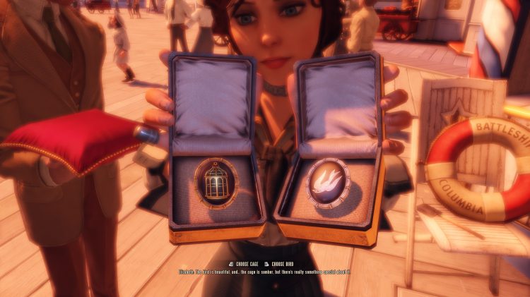 Also unlike the previous two games in the series, it married the themes and the theory to a story that offered a tangible, personal connection to hold onto, one that was perhaps machined for the 18-35 male demographic that the game was aimed at: an emotional thrill ride alongside Elizabeth, a barely-nineteen-year-old Disney princess who both does and does not need saving in turn, full of quirky life and strange magical powers, with the player put in the role of a broken, self-pitying alcoholic who is good for nothing (except being a ruggedly handsome older man who plays the acoustic guitar fantastically well and can kill an entire standing army with a Mauser pistol and a couple magazines of ammunition) and swings wildly between seeing her as a burden and as salvation. Helps that he turns out to secretly be one of the most important people in the world, too.