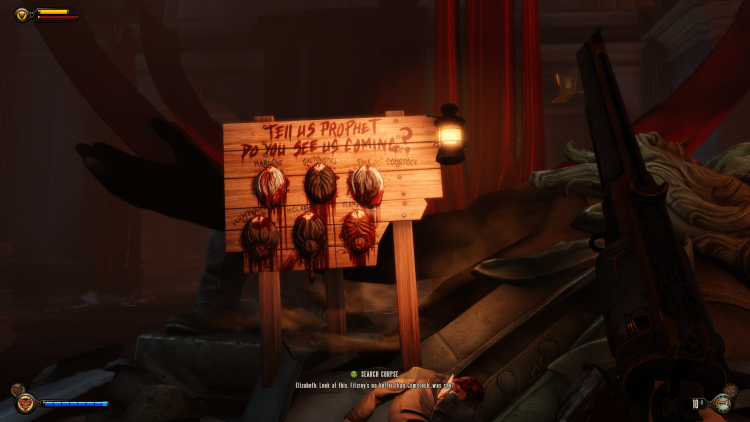 The idea that the Vox Populi and the Columbians are fundamentally the same in everything but aesthetics is key to the back half of this game, and manifests in the rebels committing ever-increasingly gruesome war crimes -- lining up civilians and shooting them, torturing women, letting you know in only slightly-veiled terms what they’re going to do to Elizabeth after they kill you, and in two rather egregiously ham-fisted moments, aping the Khmer Rouge by ordering the killing of anyone wearing glasses, and brutally scalping a half-dozen of the administrators of Finkton. All the while, Elizabeth tells you more and more directly that both sides are in fact the same. Usually this is read as a facile, direct equation of radical leftism to settler colonialism, and it most certainly is, but it’s important to realize that ever since Booker and Elizabeth made that first jump to find Chen Lin, the game has ceased being “about” white supremacy. It is fully about these two characters and the concept of destiny, fate, and being able to change one’s future. Both sides have to be the same because the game has to reinforce that no matter how much you struggle against destiny (or whatever you wish to call it), outcomes have been preordained. This is actually an ongoing mechanical gag too -- every time Booker is given a choice of doing something by pressing the left or right trigger, it's either completely meaningless (like the "choice" below) or a third thing happens before he can do the thing he originally intended to do.