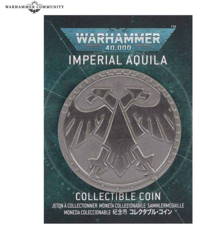 On the left is the Imperial Laurel coin, which was a recent promotional item given out in stores for August of this year. That same month Games Workshop held a